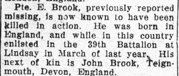 Family Search: When Private Edward Brook was born on 26 October 1894, in Teignmouth, Devon, England, United Kingdom, his father, John Brook, was 43 and his mother, Gertrude Mary Prime, was 26. He immigrated to Canada in 1913 and lived in St George Hanover Square, London, England, United Kingdom in 1901. He registered for military service in 1915. In 1915, at the age of 21, his occupation is listed as chauffeur. He died on 15 September 1916, in Courcelette, Somme, Picardie, France, at the age of 21, and was buried in Vimy, Pas-de-Calais, Nord-Pas-de-Calais, France.