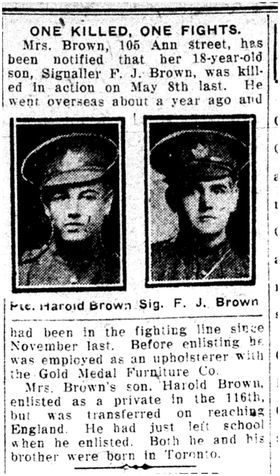 Signaller F.G. [F.J.] Brown, whose mother resides at 105 Anne street, was killed in action on May 10. He left for overseas in June 1916, and had been in the trenches since November. He was born in Toronto 18 years ago, and at the time of enlistment was engaged as an upholsterer. He was a member of the West End Y.M.C.A., and attended Westmoreland Methodist Church. His brother Harold, 17 years of age, is also in the trenches.