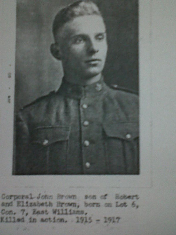 Sad news was received today on Sunday last by Mrs. Brown, that her son, John, had been killed in action somewhere in France on April 9th after being in the front for two and a half years. Deceased was among the first of the Canadian boys to answer the call. He was a fine type of young manhood, a good soldier and had been promoted some time ago from the ranks as a result of his valor. He was well-known in this community, and highly respected. Mrs. Brown is a widow and have two other sons in the war. Robt. [Robert] who enlisted in the North West, is slowly recovering from the effects of a gas attack and Leonard is in the Middlesex boys who were recently reported in the thick of the fighting.
