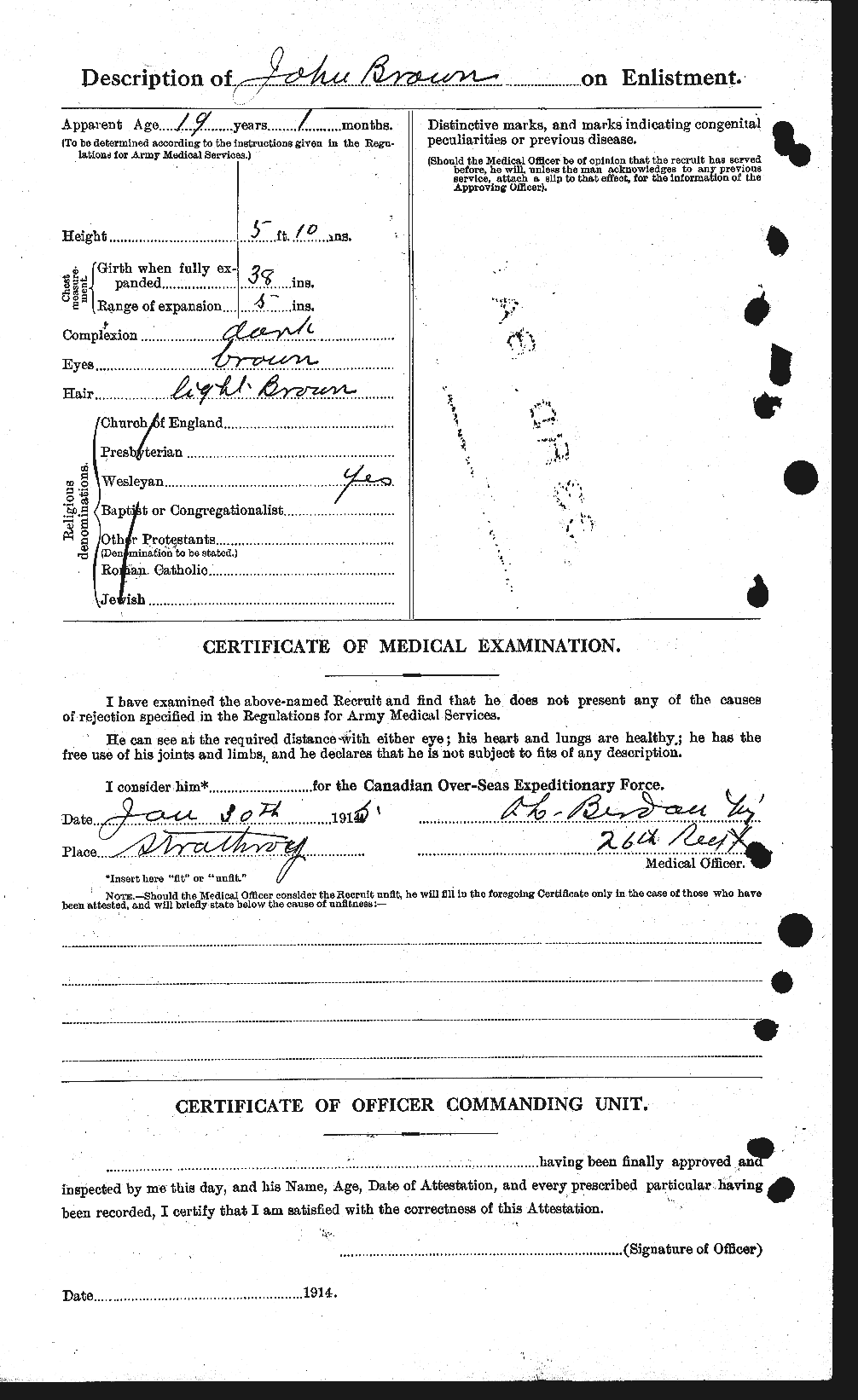 John was born on December 18, 1895 in Mount Brydges to Elizabeth and Robert Brown. His enlistment forms, signed in January 1915, state he was a farmer with no previous military experience.