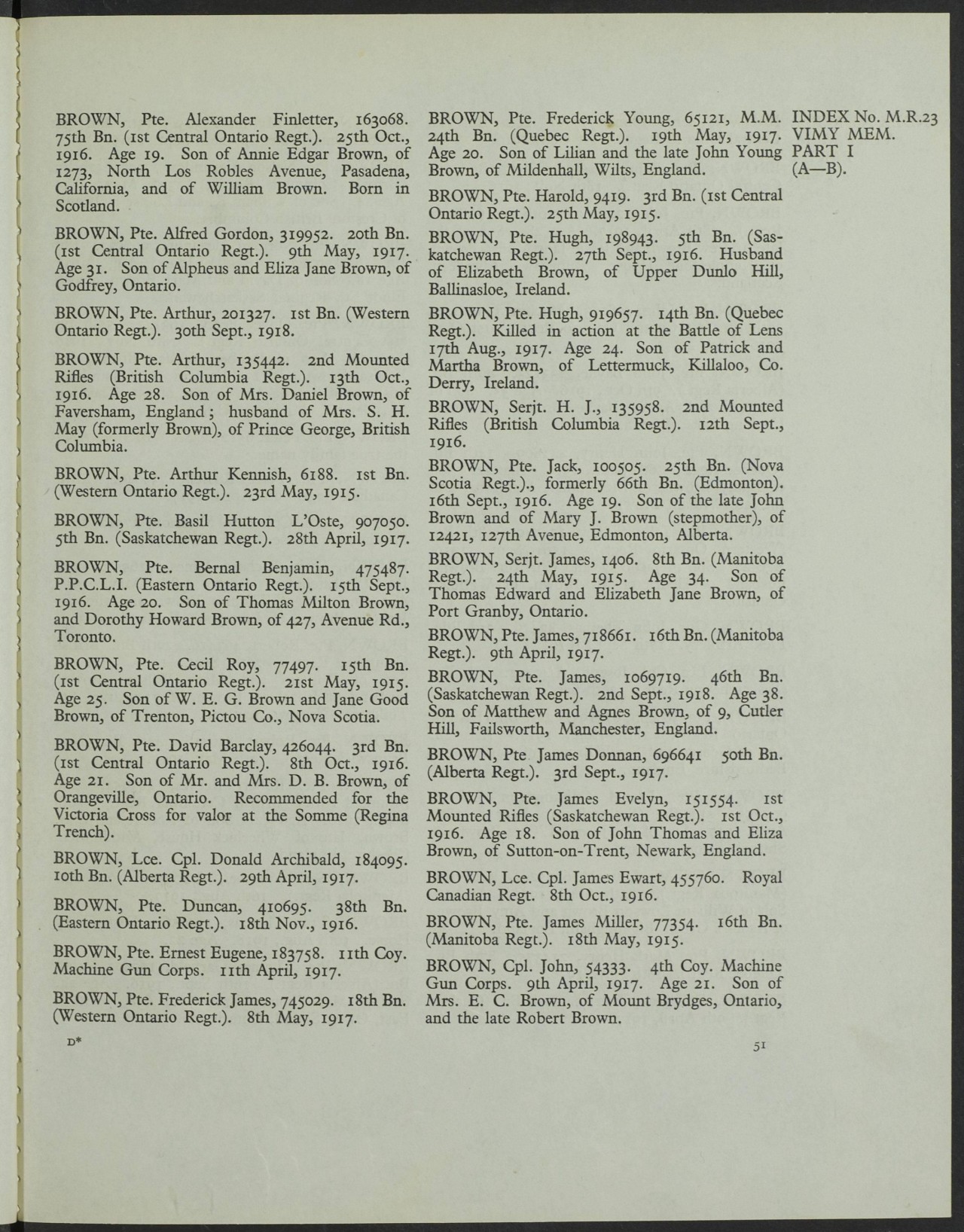 Family Search: When Corporal John Brown was born on 18 December 1895, in Carradoc, Middlesex, Ontario, Canada, his father, Robert Carlin Brown, was 44 and his mother, Elizabeth “Hannah” Caroline Schram, was 34. He lived in Middlesex, Ontario, Canada in 1901 and Mount Brydges, Strathroy-Caradoc, Middlesex, Ontario, Canada in 1915. He registered for military service in 1915. In 1915, at the age of 20, his occupation is listed as farmer in Mount Brydges, Strathroy-Caradoc, Middlesex, Ontario, Canada. He died on 9 April 1917, in Vimy, Pas-de-Calais, Nord-Pas-de-Calais, France, at the age of 21.