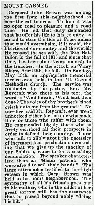 Corporal John Brown was among the first from this neighborhood to hear the call to arms. To him it was no open road to pleasure and a good time. He felt that duty demanded that he offer his life to his country as an aid to stem the tide of Prussianism that would overwhelm, if it could, the liberties of our country and the world. He crossed the sea with the 18th Battalion in the fall of 1915 and sine that time, has been almost continuously in the trenches. In the attack on Vimy Ridge, April 9th, he fell. On Sunday May 13th, an appropriate memorial service was held in the Mt. Carmel Methodist church. The service was conducted by the pastor, Rev. Mr. Reycraft who chose as his text, the words: “And he said, What hast thou done? The voice of thy brothers’ blood crieth unto me in the ground.” No sacrifice, said Mr. Reycraft, ever went unnoticed either for the one who made it or for those who suffer with them. He commended highly those who so freely sacrificed all their prospects in the order to defend their country. Those who talk so glibly about the necessity of increased food production, demanding that we give up the sanctity of our Sabbath, came in for a scathing denunciation. The speaker characterized them as “Sham patriots who were afraid to soil their hands,” The large attendance testified to the high esteem in which Corp. Brown was held in his home neighborhood. The sympathy of all his friends goes out to his mother, who in the midst of her great sorrow stall has the assurance that he passed beyond nobly “doing his bit.”