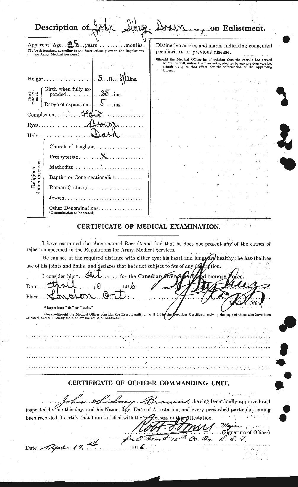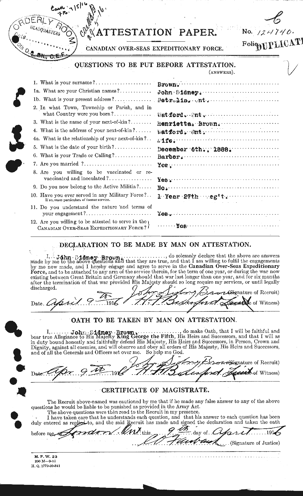 | April 9, 1916 | Enlists | Enlists at London, Ontario with the 70th Overseas Battalion. He is a barber married to Henrietta Brown listed as his next-of-kin. He has prior military experience showing service with the 27th Regiment for 1-year. Standing 5’6.5” tall he has a fair complexion, brown eyes, and dark hair. He is Presbyterian. He has a chest expansion of 5 inches with a chest girth of 30 inches. He weighs 125 lbs. At 28-years old he is above average in age for enlisting. |