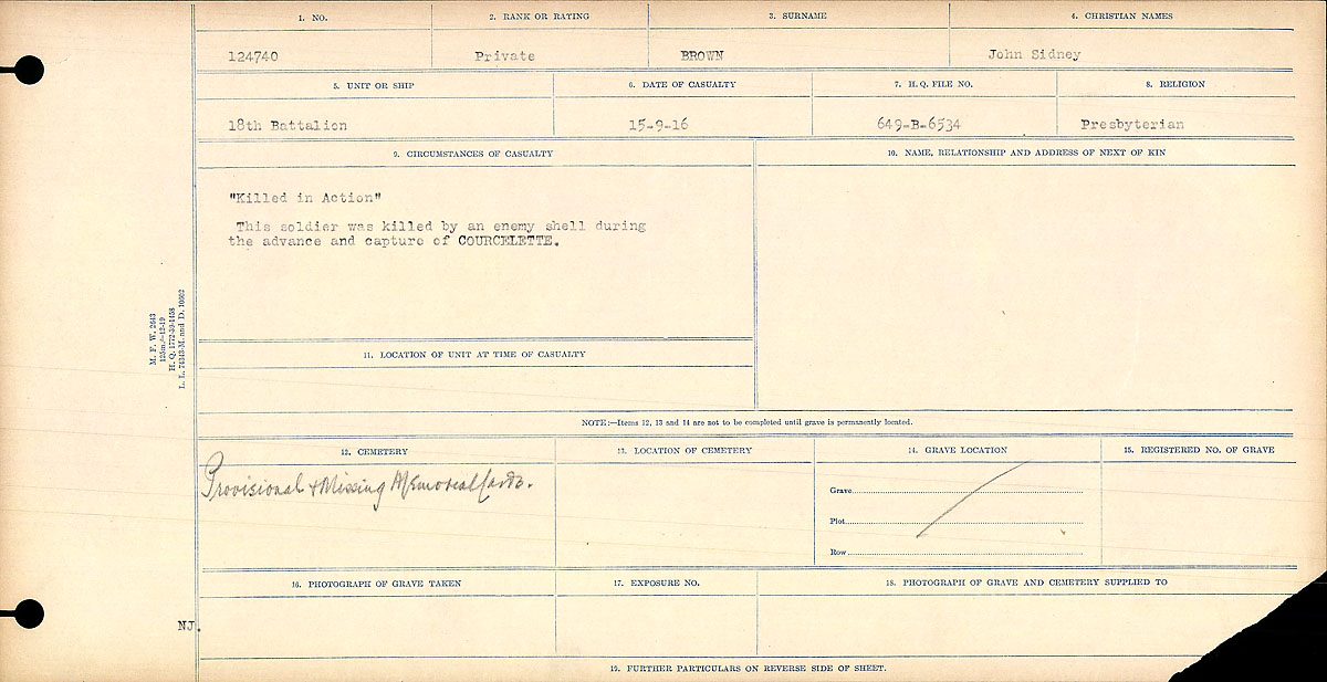 @CWGC Great Grandpa John Sidney Brown, CEF 18th Battalion, KIA Battle of the Somme – September 1916. Buried?