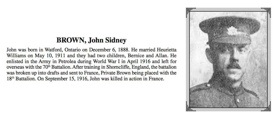 Family Search: When Private John Sidney Brown was born on 6 December 1888, in Warwick Township, Lambton, Ontario, Canada, his father, Jacob Daniel Brown, was 25 and his mother, Anna Christiana Smith, was 25. He married Henrietta Maria Williams on 10 May 1911, in Watford, Lambton, Ontario, Canada. They were the parents of at least 1 son and 3 daughters. He lived in Lambton, Ontario, Canada in 1901 and Petrolia, Lambton, Ontario, Canada in 1916. He registered for military service in 1916. In 1916, his occupation is listed as barber in Petrolia, Lambton, Ontario, Canada. He died on 15 September 1916, in Vimy, Pas-de-Calais, France, at the age of 27, and is commemorated at Vimy, Pas-de-Calais, France.