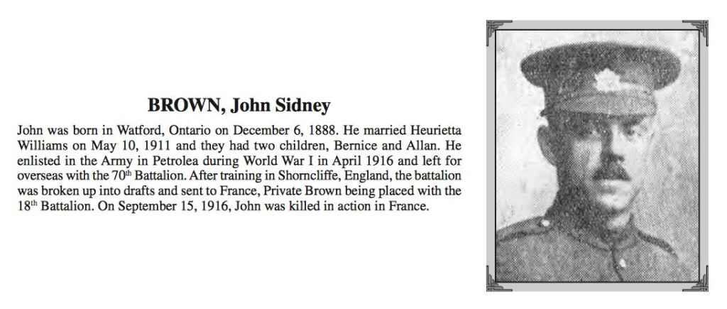 John Sidney Brown, of Watford, Ontario has no known grave but for an inscription on the Vimy Memorial. The war diary of the 18th Battalion indicates that on the night of September 14th, 1916 there was an attack on the German lines with a 1200 yard penetration. The Battalion was located near Albert, France on the Somme battlefield at a location commonly referred to as “The Brickfields” The war diary makes no mention of the soldiers killed or wounded on this date and given the low number of pages and the brevity of the entries the person(s) responsible kept a very basic record of the action on one of the deadliest fronts in the Great War.