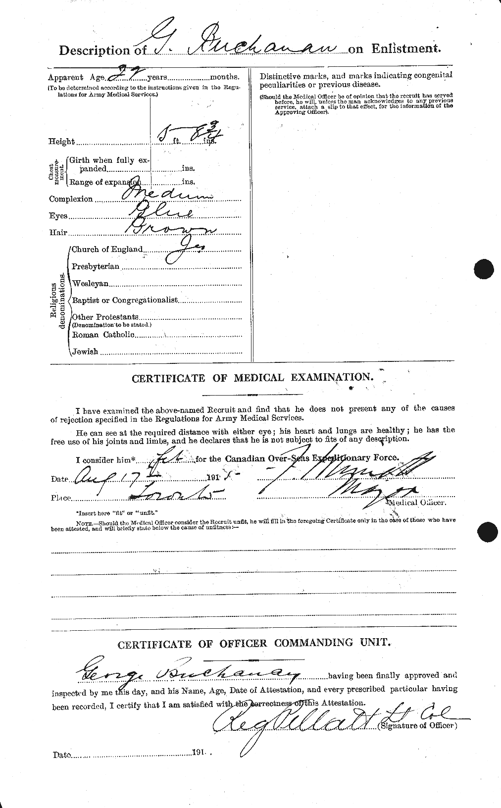 | August 7, 1915 | Enlists | 22-year old teamster George Buchanan enlisted at the armouries with the 83rd Battalion at Toronto, Ontario on this date. He listed his mother, Mrs. William Buchanan, as his next-of-kin and at the time of his enlistment he stood 5’8.75” tall and was listed as having a medium complexion, blue eyes, and brown hair. He weighed 130 pounds. He practiced Anglicism as he indicated he was a member of the Church of England. He had no prior military experience. |