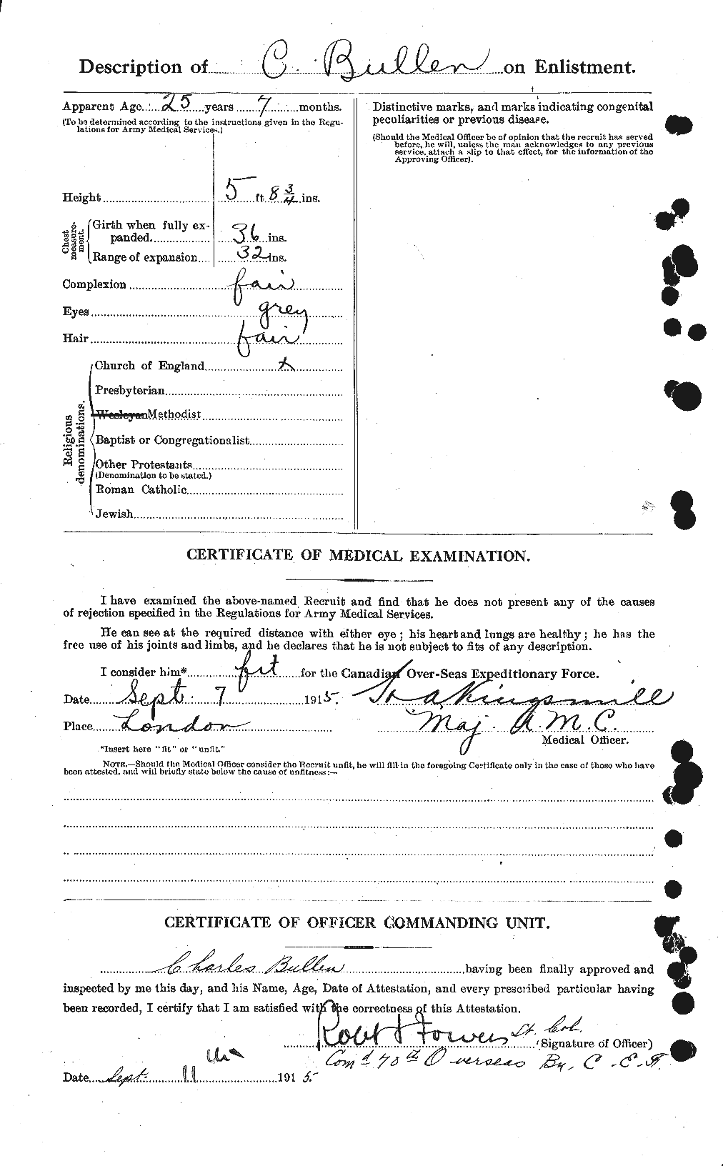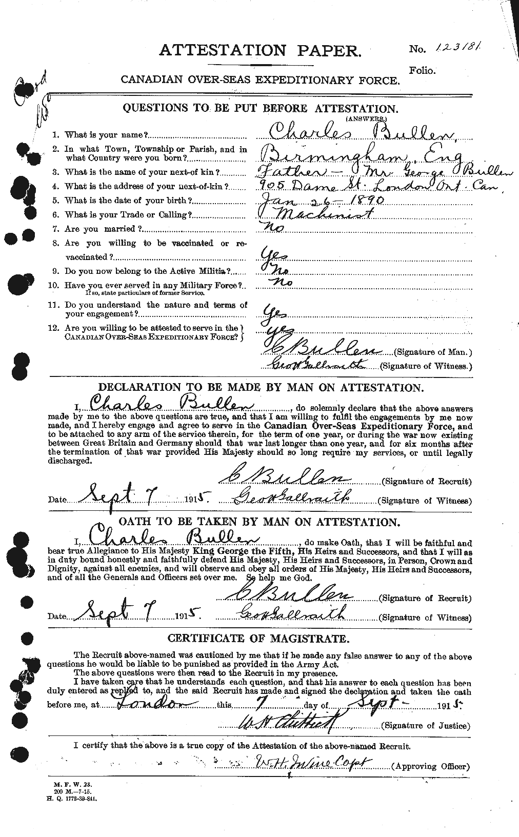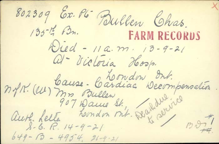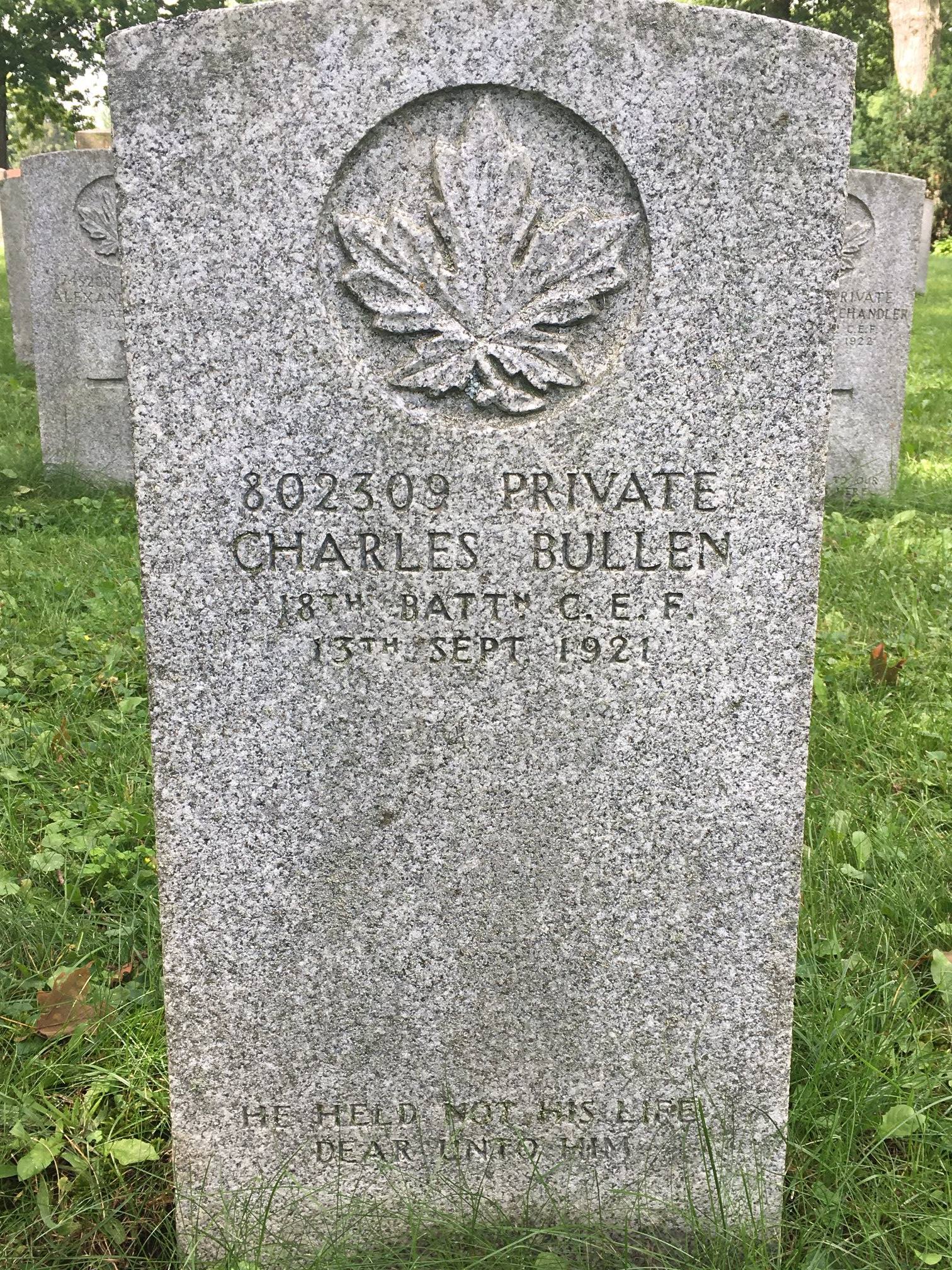 Family Search: When Private Charles Bullen was born on 26 January 1895, in Birmingham, Warwickshire, England, United Kingdom, his father, George Bullen Sr, was 29 and his mother, Ann Bickley, was 30. He married Florence May Farrar on 31 May 1916, in London, Ontario, Canada. He immigrated to Canada in 1906 and lived in London, Ontario, Canada in 1915. He registered for military service in 1915. In 1915, at the age of 20, his occupation is listed as mechanic in London, Ontario, Canada. He died on 13 September 1921, in London, Ontario, Canada West, British Colonial America, at the age of 26, and was buried in Mount Pleasant Cemetery, London, Ontario, Canada.