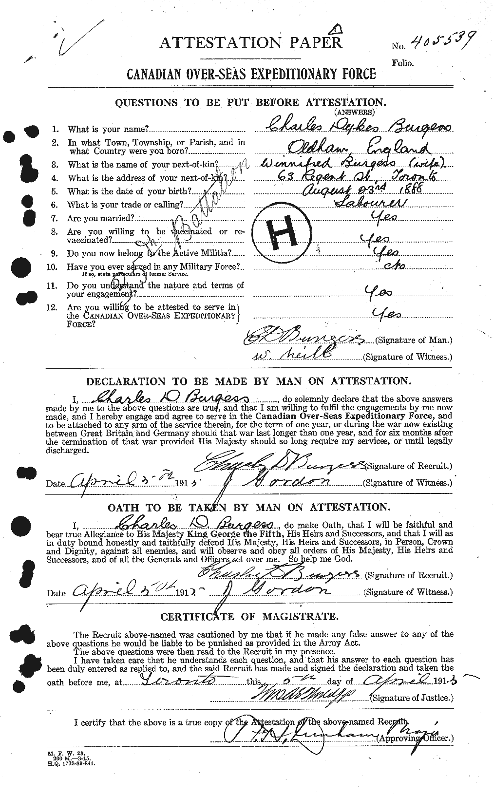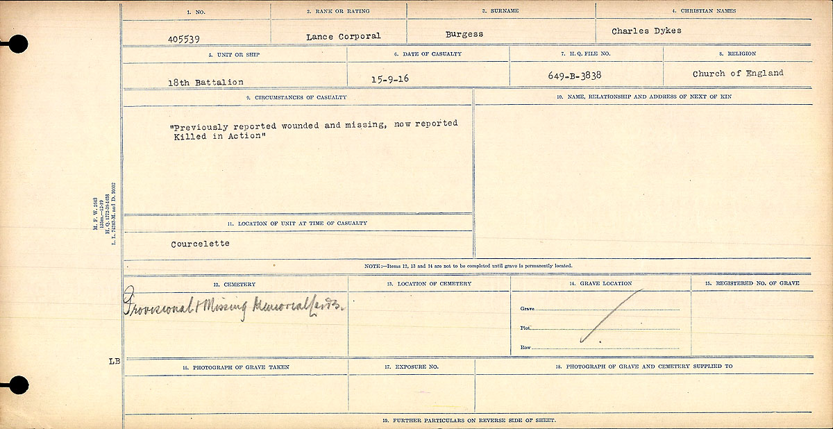 Family Search: Lance Corporal Charles Dyke Burgess was born on 23 August 1888, in Oldham, Greater Manchester, England, United Kingdom as the son of Chales Burgess and Harriet Barker. He married Winnifred Clara Dale on 9 December 1909, in Cobourg, Northumberland, Ontario, Canada. They were the parents of at least 2 sons and 1 daughter. He immigrated to Canada in 1902 and lived in Toronto, York, Ontario, Canada in 1915. He registered for military service in 1915. In 1915, at the age of 27, his occupation is listed as motorman, toronto street railway in Toronto, Ontario, Canada. He died on 15 September 1916, in Courcelette, Somme, Picardie, France, at the age of 28, and was buried in Vimy, Pas-de-Calais, Nord-Pas-de-Calais, France.