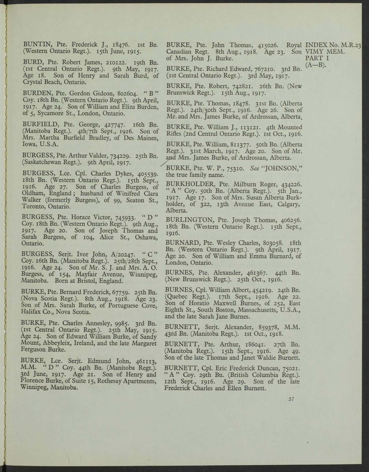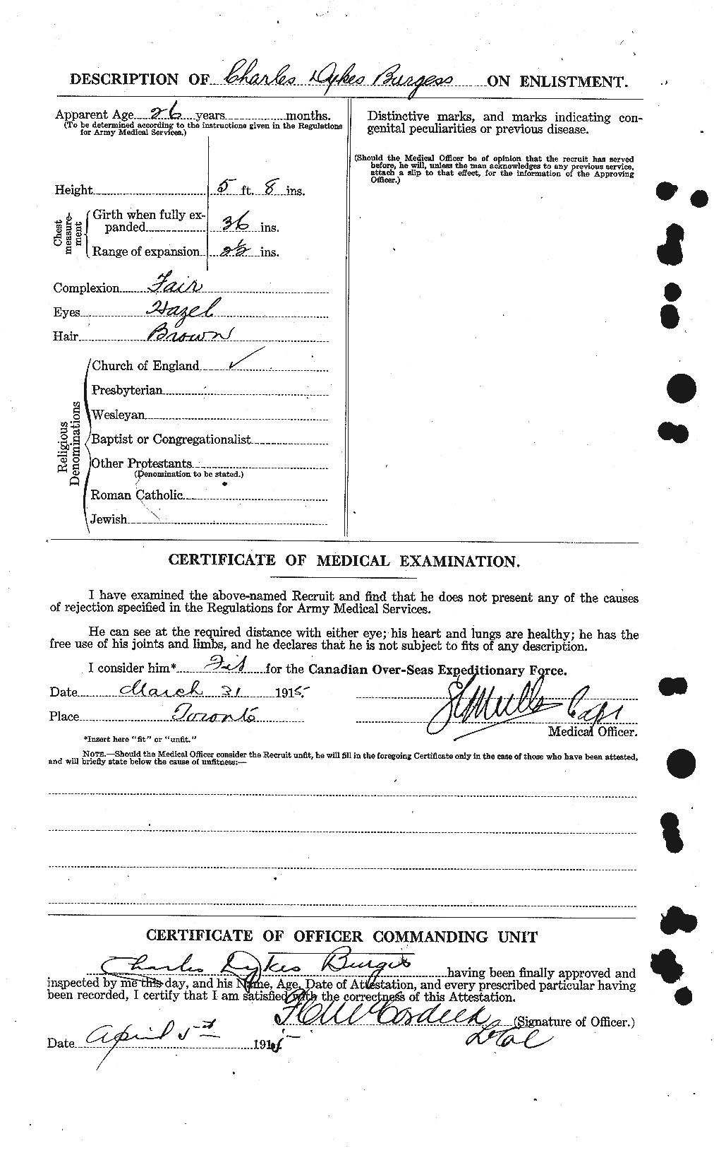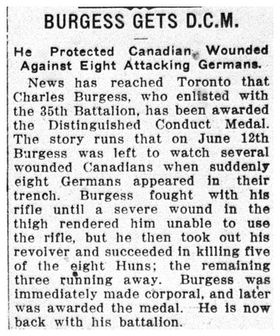 Pte. Charles Dykes Burgess, 135 Seaton street, a former motorman on the Toronto Street Railway, was wounded on September 15 and afterwards reported missing. He is 28 years old and was born in England. He has been 12 years in Canada. His brother Alan [Allan Bugess, 91715] enlisted in the artillery at Cobourg and another brother, John, enlisted from Australia.