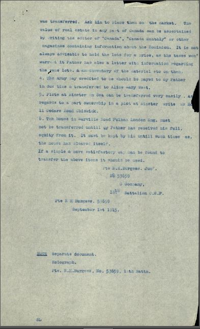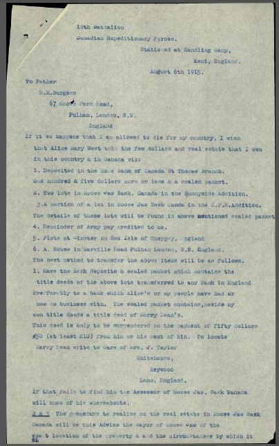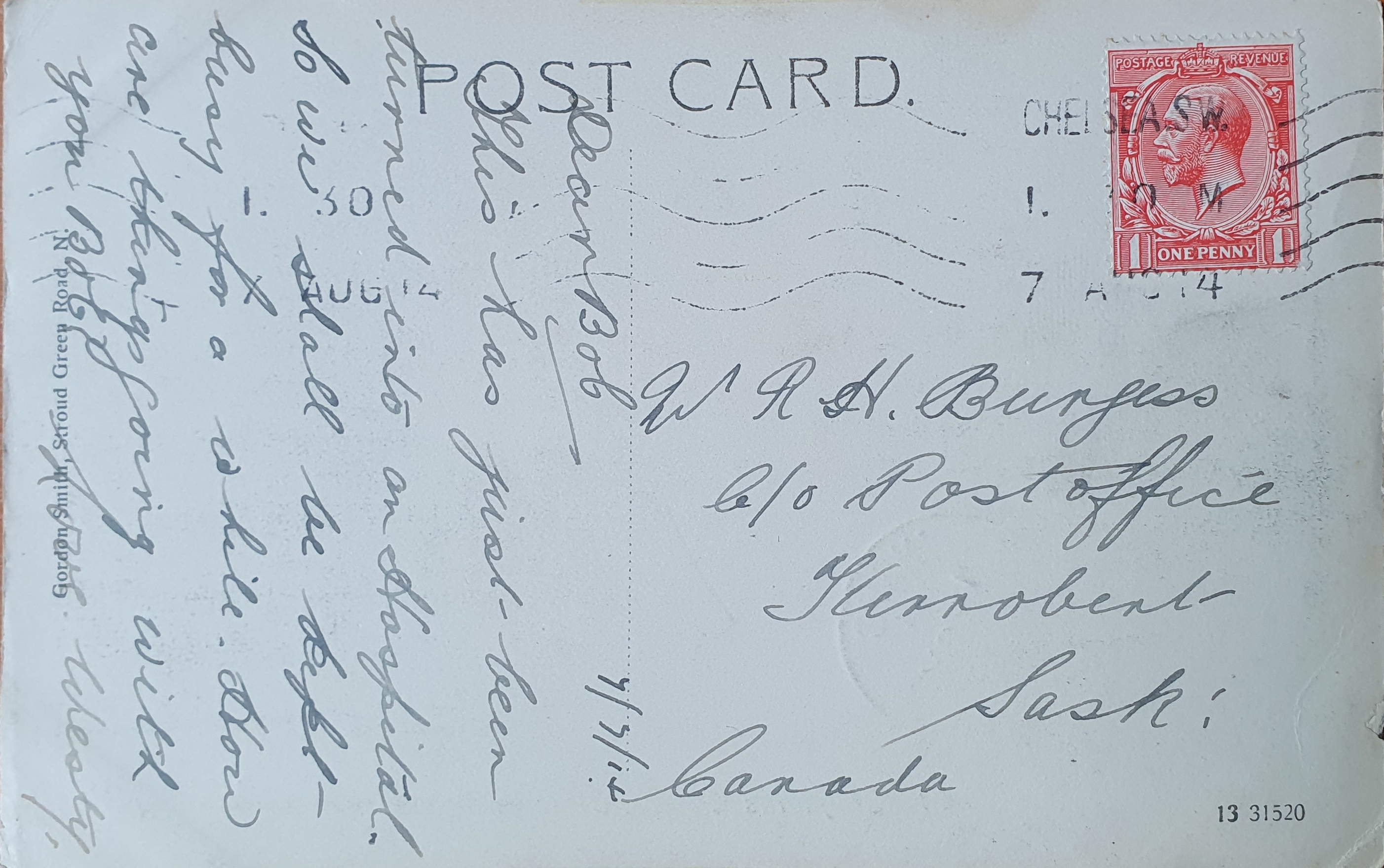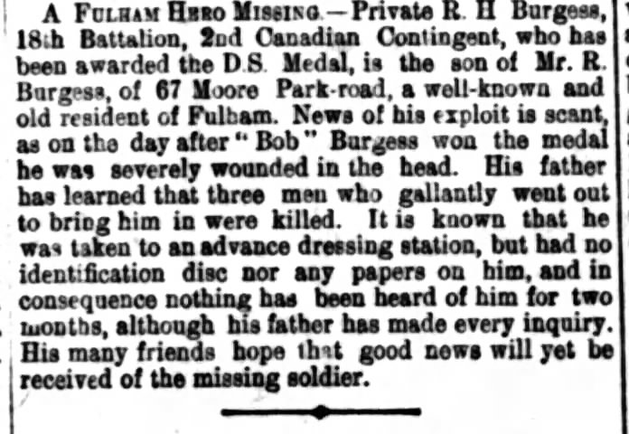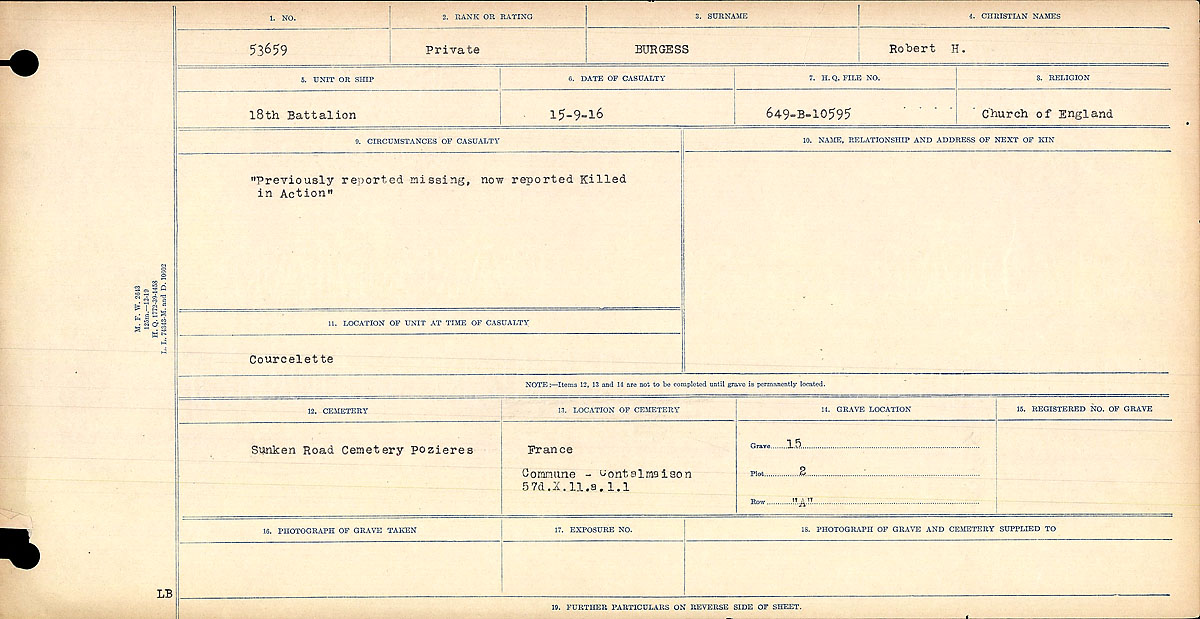 Family Search: When Private Robert Henry Burgess was born on 1 February 1885, in Fulham, London, England, United Kingdom, his father, Robert Henry Burgess, was 37 and his mother, Eliza Griggs, was 33. He immigrated to Canada in 1914 and lived in Tottenham, Middlesex, England, United Kingdom in 1939. He registered for military service in 1914. In 1914, at the age of 29, his occupation is listed as carpenter. He died on 15 September 1916, in Courcelette, Somme, France, at the age of 31, and was buried in Contalmaison, Somme, France.