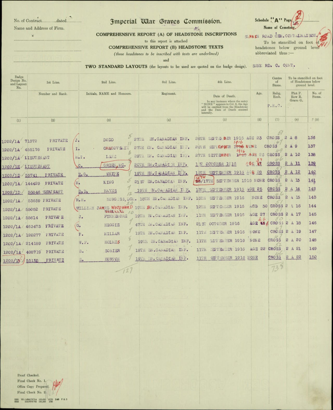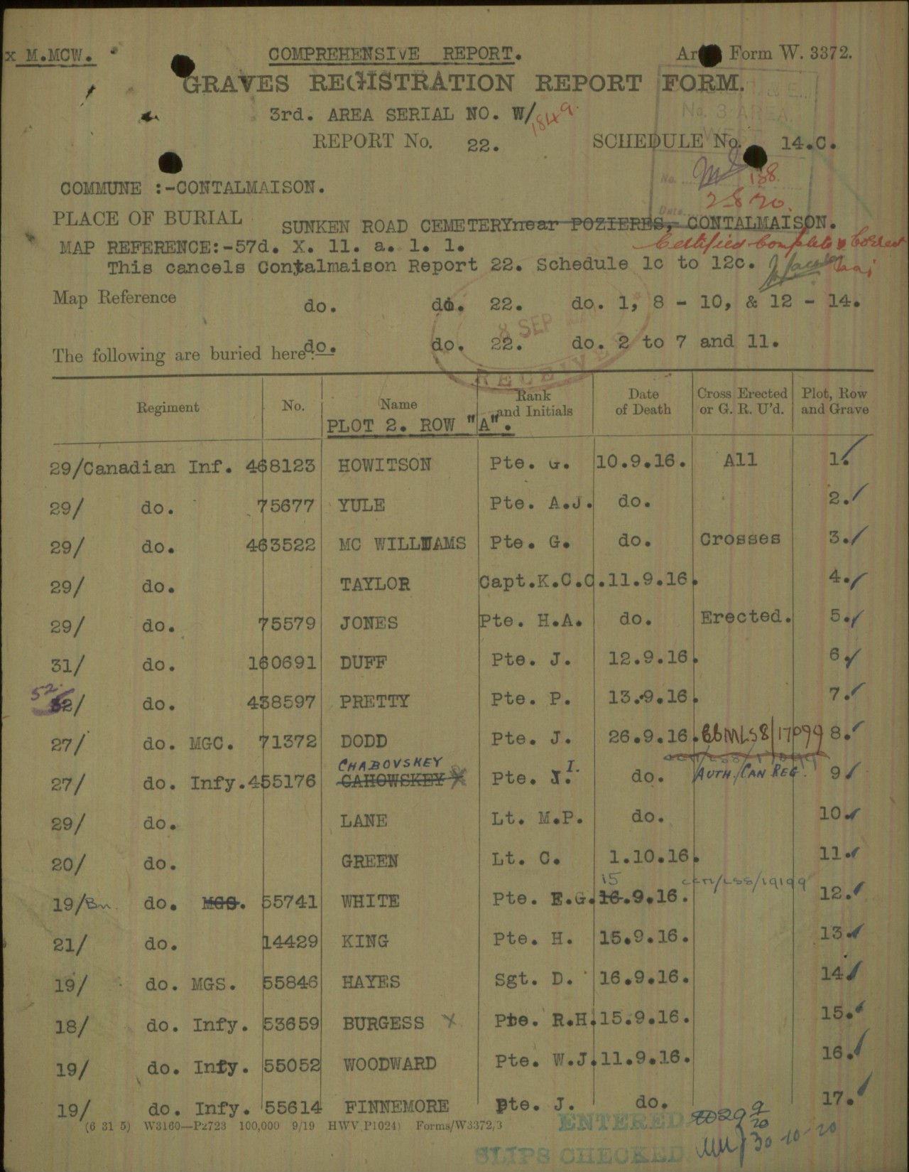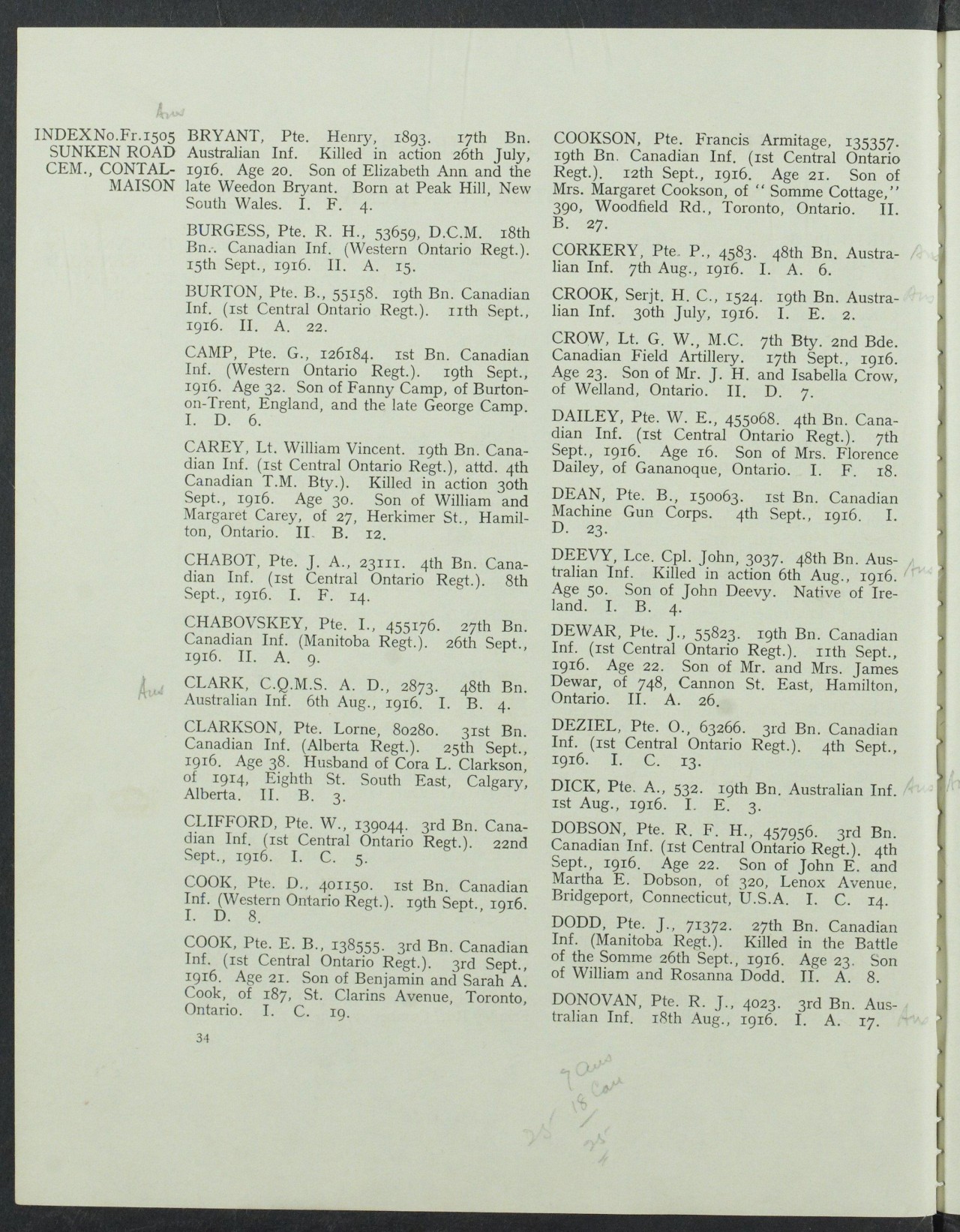 Family Search: When Private Robert Henry Burgess was born on 1 February 1885, in Fulham, London, England, United Kingdom, his father, Robert Henry Burgess, was 37 and his mother, Eliza Griggs, was 33. He immigrated to Canada in 1914 and lived in Tottenham, Middlesex, England, United Kingdom in 1939. He registered for military service in 1914. In 1914, at the age of 29, his occupation is listed as carpenter. He died on 15 September 1916, in Courcelette, Somme, France, at the age of 31, and was buried in Contalmaison, Somme, France.