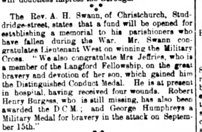 “For conspicuous gallantry and resource during operations. When, owing to casualties, the crews of some machine guns found themselves without escort, Private Burgess, although wounded, organized escorts of bombers, and assumed command until he was wounded seriously a second time.”