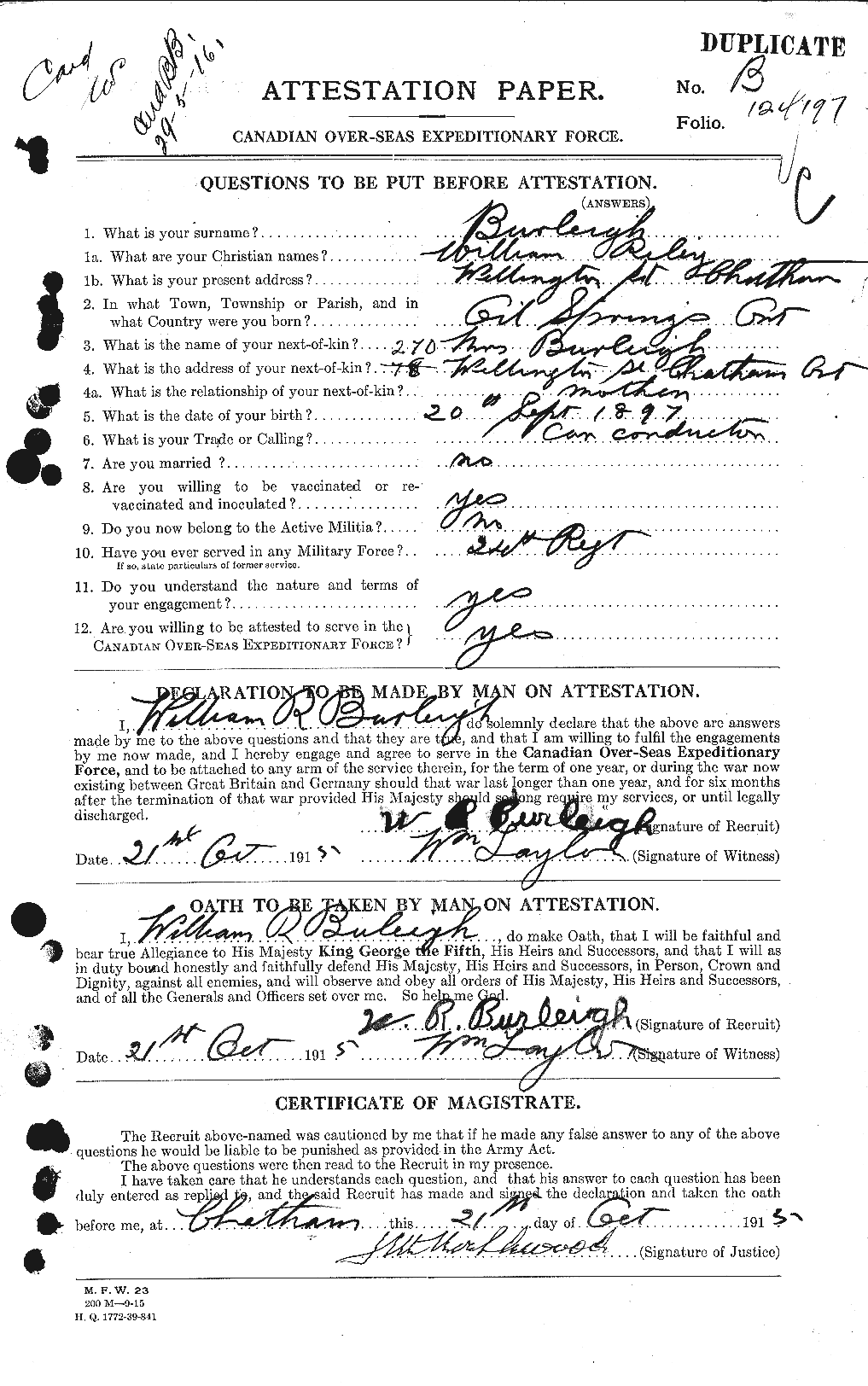 He was an 18-year-old car conductor when he enlisted in the CEF with the 70th Battalion. He had prior militia experience with the 24th Regiment and attested at Chatham, Ontario on October 21, 1915.