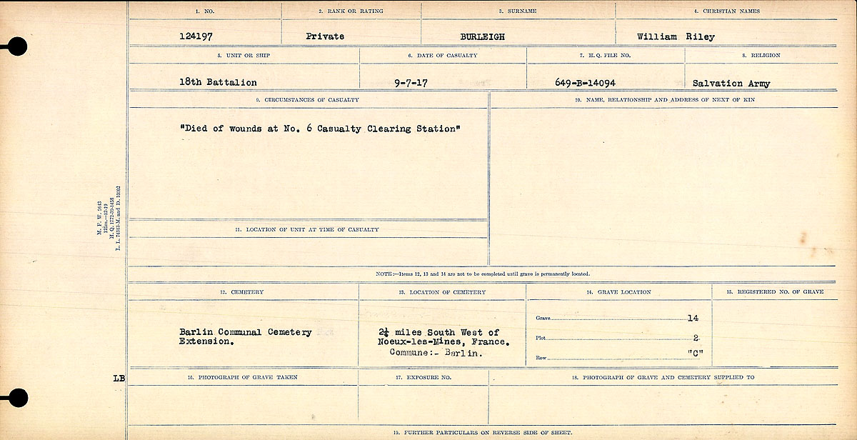 He was wounded by a shell bursting in the billet he was staying in, along with several other members of the 18th Battalion. He would succumb to those wounds.