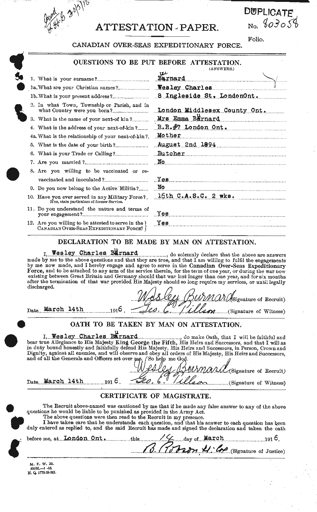 This man enlisted with the 135th Overseas Battalion on 14 March 1916, at London, Ontario. he was a butcher by trade and a Methodist.