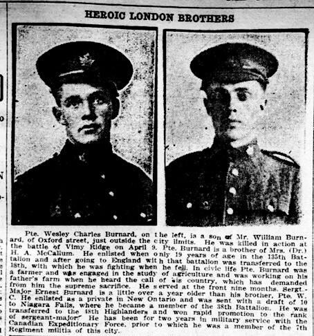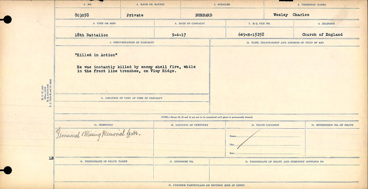 Family Search: When Private Wesley Charles Burnard was born on 2 August 1896, in London Township, Middlesex, Ontario, Canada, his father, William Henry Burnard, was 39 and his mother, Emma Tremaine, was 38. He lived in Middlesex, Ontario, Canada in 1901 and London, Ontario, Canada in 1916. He registered for military service in 1916. In 1916, at the age of 20, his occupation is listed as butcher in London, Ontario, Canada. He died on 9 April 1917, in Thélus, Pas-de-Calais, France, at the age of 20, and was buried in Vimy, Pas-de-Calais, France.