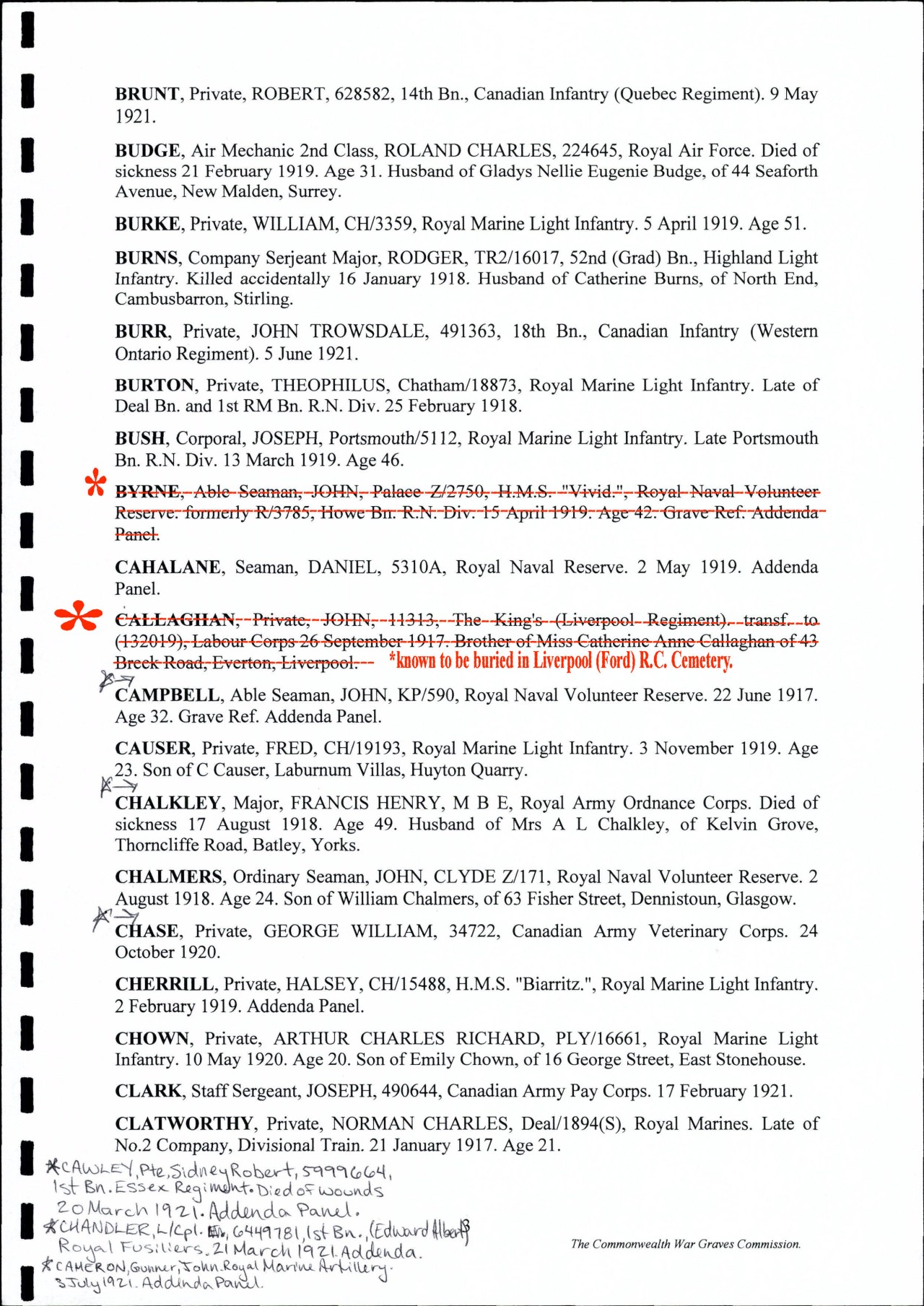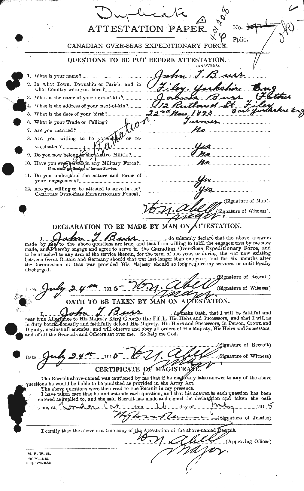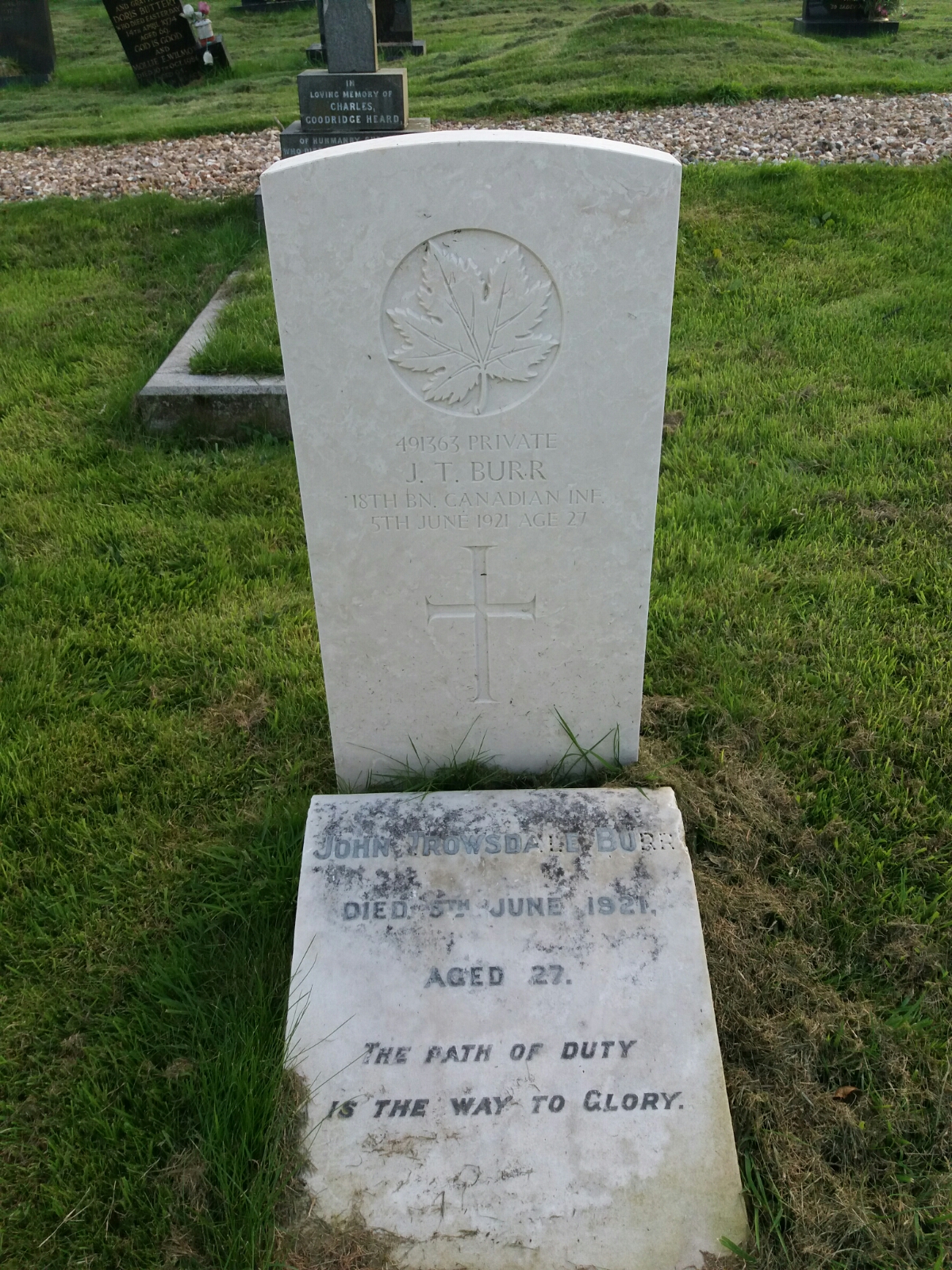 Family Search: Private John Trowsdale Burr was born on 22 November 1893, in Filey, Yorkshire, England, United Kingdom as the son of James Burr and Rachel Burr. He married Elsie May Smith in 1918, in Scarborough, Yorkshire, England, United Kingdom. They were the parents of at least 1 daughter. He immigrated to Canada in 1913. He registered for military service in 1916. In 1916, at the age of 23, his occupation is listed as farmer. He died on 5 June 1921, in England, United Kingdom, at the age of 27, and was buried in Woking, Surrey, England, United Kingdom.