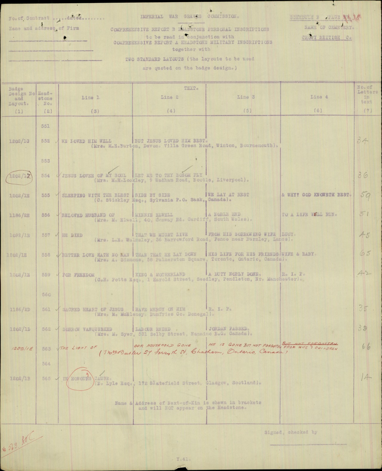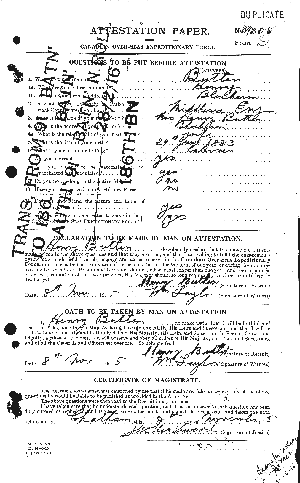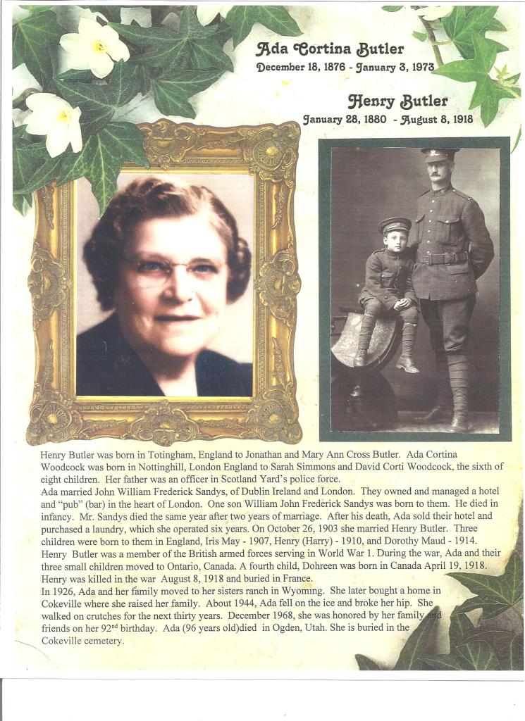 They immigrated to Ontario, Canada in October, 1914 with their three small children. Henry Butler joined the Canadian Armed Forces in 1915 and served in World War I. A fourth child, Dohreen was born in Canada on April 19, 1918. Henry was killed on August 8, 1918, in Marcelcave, France and buried at Croix, Somme, Picardie, France.