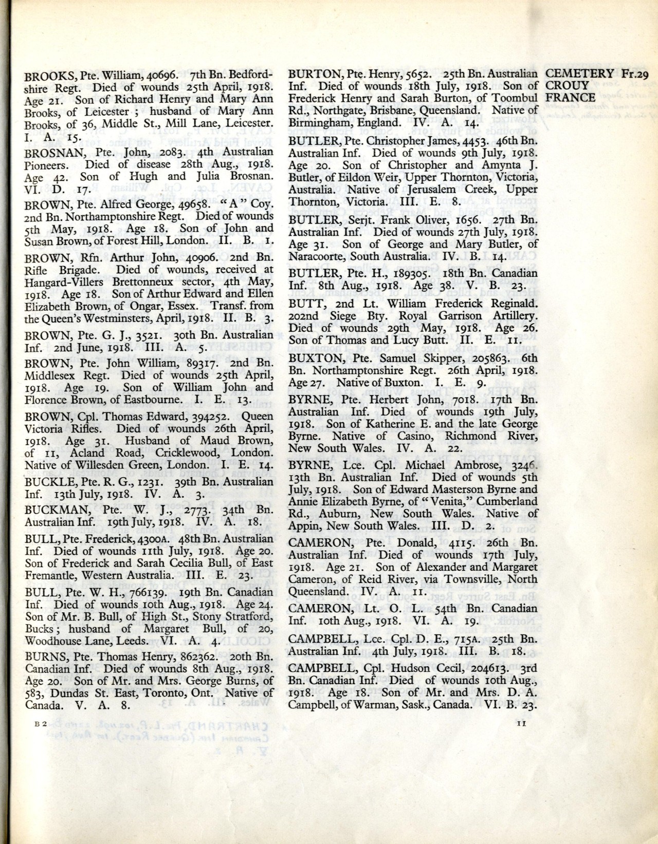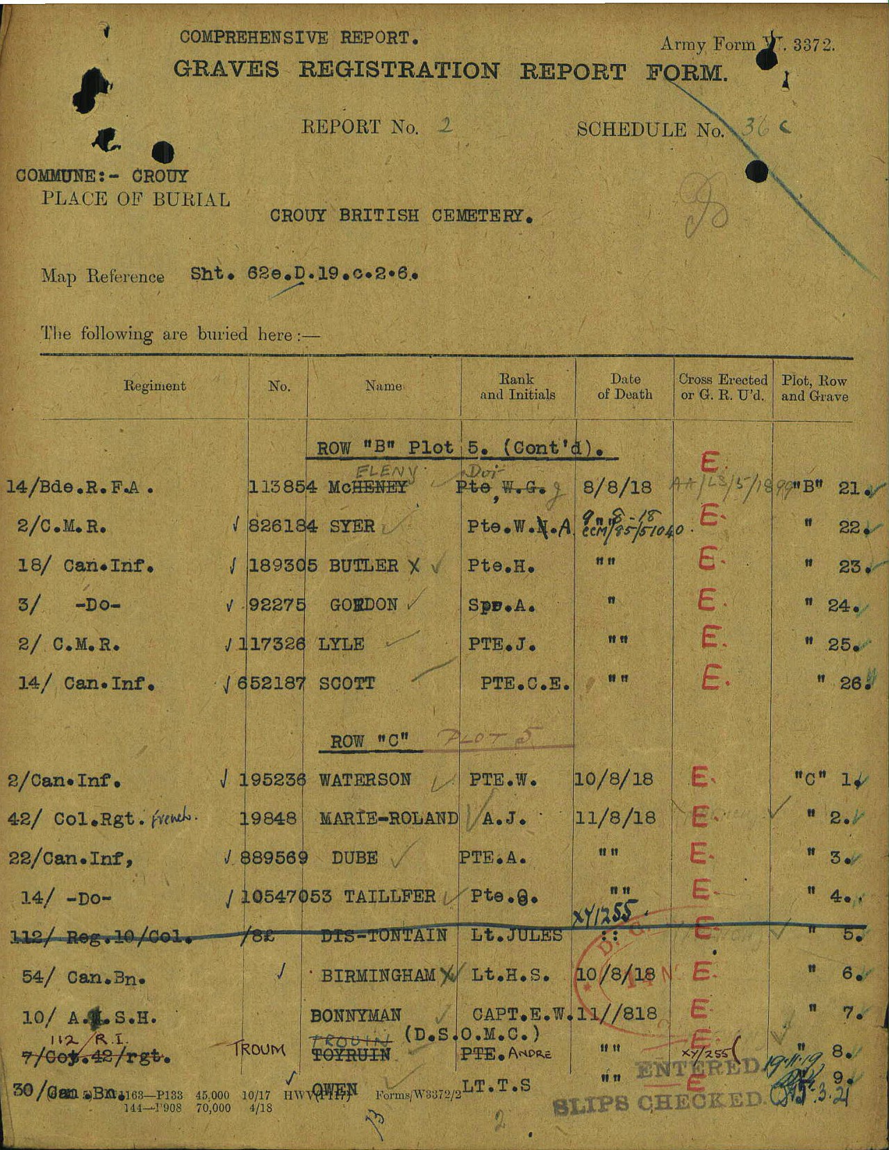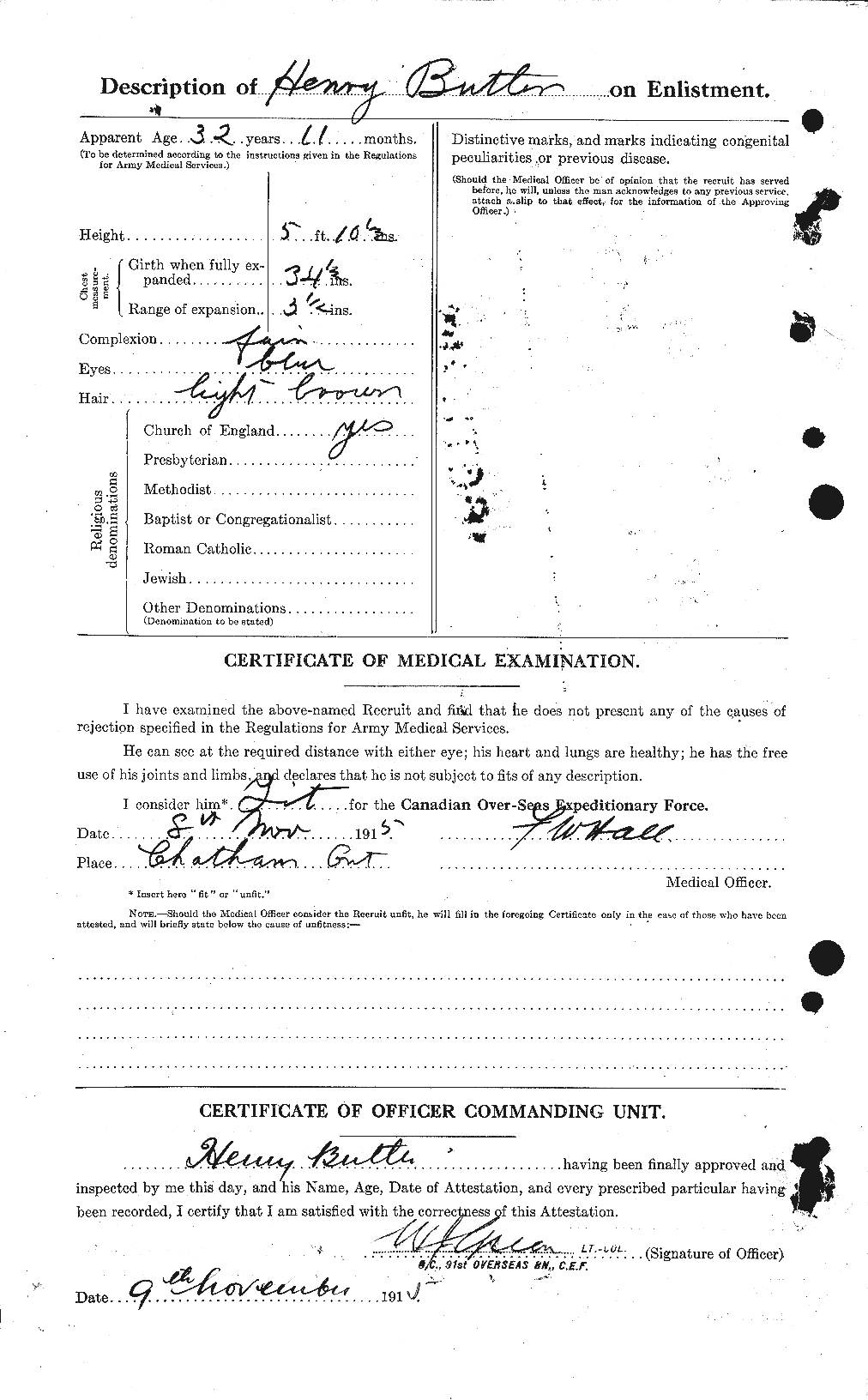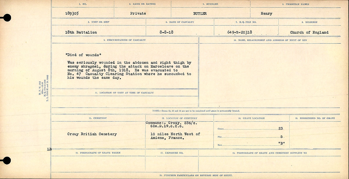 Family Search: When Private Henry Butler was born on 28 January 1883, in Tottenham, Middlesex, England, United Kingdom, his father, Jonathan Butler, was 45 and his mother, Mary Ann Cross, was 38. He married Ada Cortina Woodcock on 26 October 1913, in West Ham, Essex, England, United Kingdom. They were the parents of at least 1 son and 5 daughters. He lived in Barking, Essex, England, United Kingdom in 1911 and Blenheim, Kent, Ontario, Canada in 1915. He registered for military service in 1915. In 1915, at the age of 32, his occupation is listed as labourer in Blenheim Township, Oxford, Ontario, Canada. He died on 8 August 1918, in Crouy, Somme, Hauts-de-France, France, at the age of 35, and was buried in Crouy, Somme, Picardie, France.