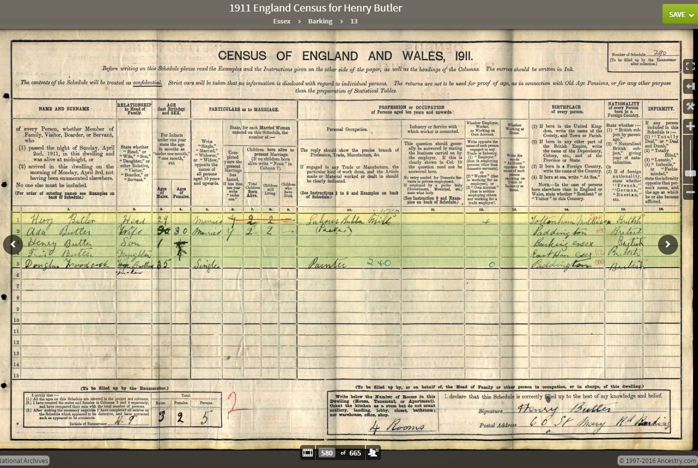 Ada married John William Frederick Sandys of Dublin, Ireland and London. They owned and managed a hotel and “pub” (bar) in the heart of London. One son, William John Frederick Sandys, was born to them in 1900. While bouncing someone out of the pub a patron kicked her husband in the privates and he died. While Ada was dealing with funeral arrangements for her husband the woman taking care of the baby dropped him and didn’t tell her and he died from injuries from the fall. Ada had lost her husband and her first child before she was 19 years old. After his death, Ada sold their hotel and purchased a laundry, which she operated for six years. On October 26, 1903, she married Henry Butler. Four children were born to them in England: Iris May and a twin sister – 1906, Henry (Harry) – 1910, and Dorothy Maud – 1914. The twin sister died shortly after birth.