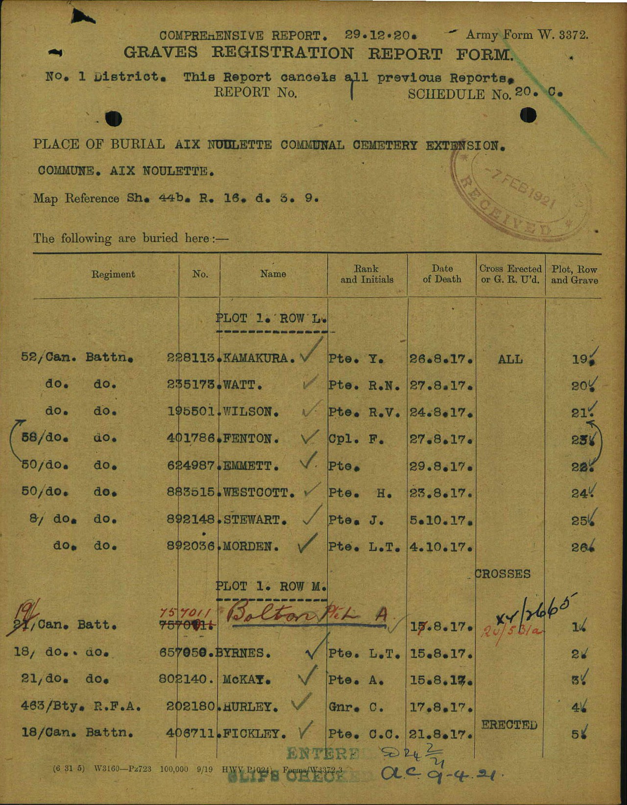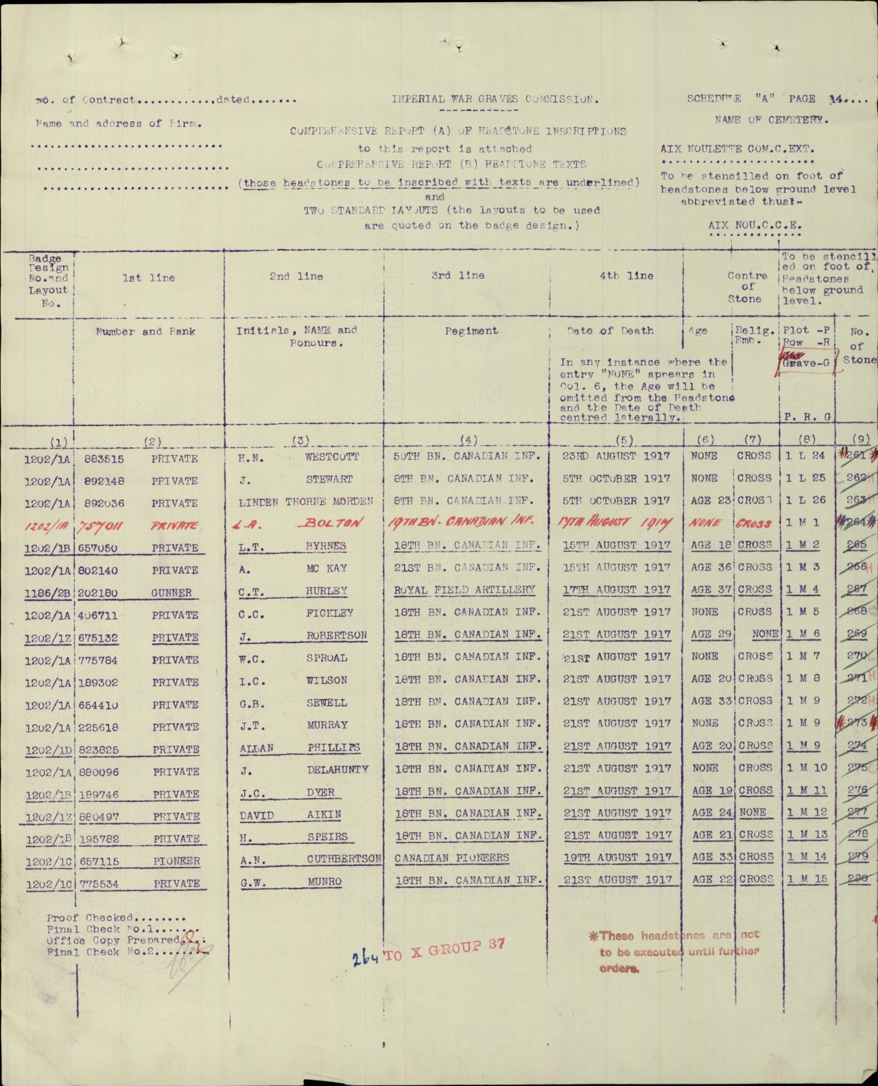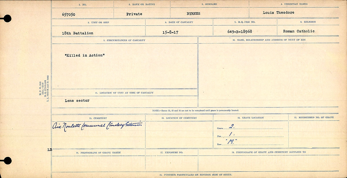 Family Search: When Private Loius Theodore Byrnes was born on 29 October 1897, in Parry Sound, Ontario, Canada, his father, William Byrnes, was 22 and his mother, Mary Amelia Wells, was 18. He registered for military service in 1916. In 1916, at the age of 19, his occupation is listed as printer in Parry Sound, Ontario, Canada. He died on 15 August 1917, in Lens, Pas-de-Calais, France, at the age of 19, and was buried in Aix-Noulette, Pas-de-Calais, Hauts-de-France, France.