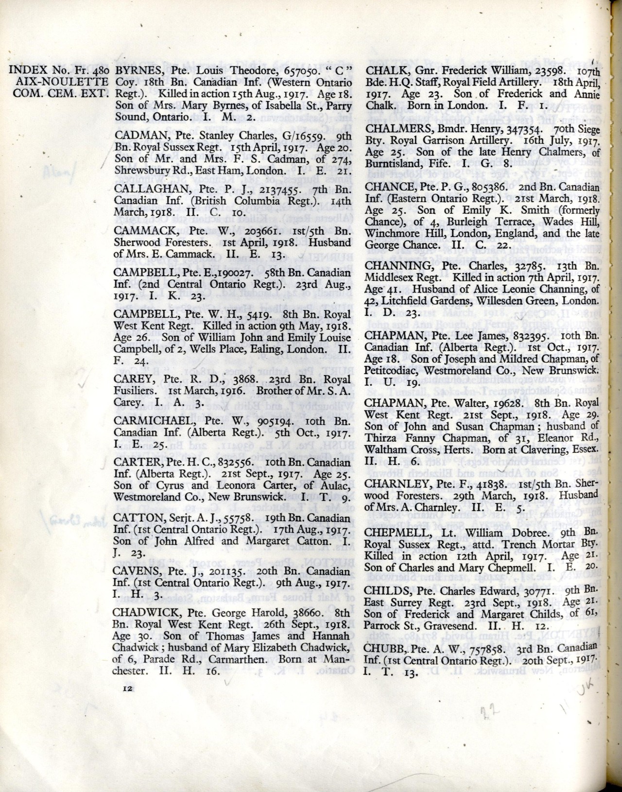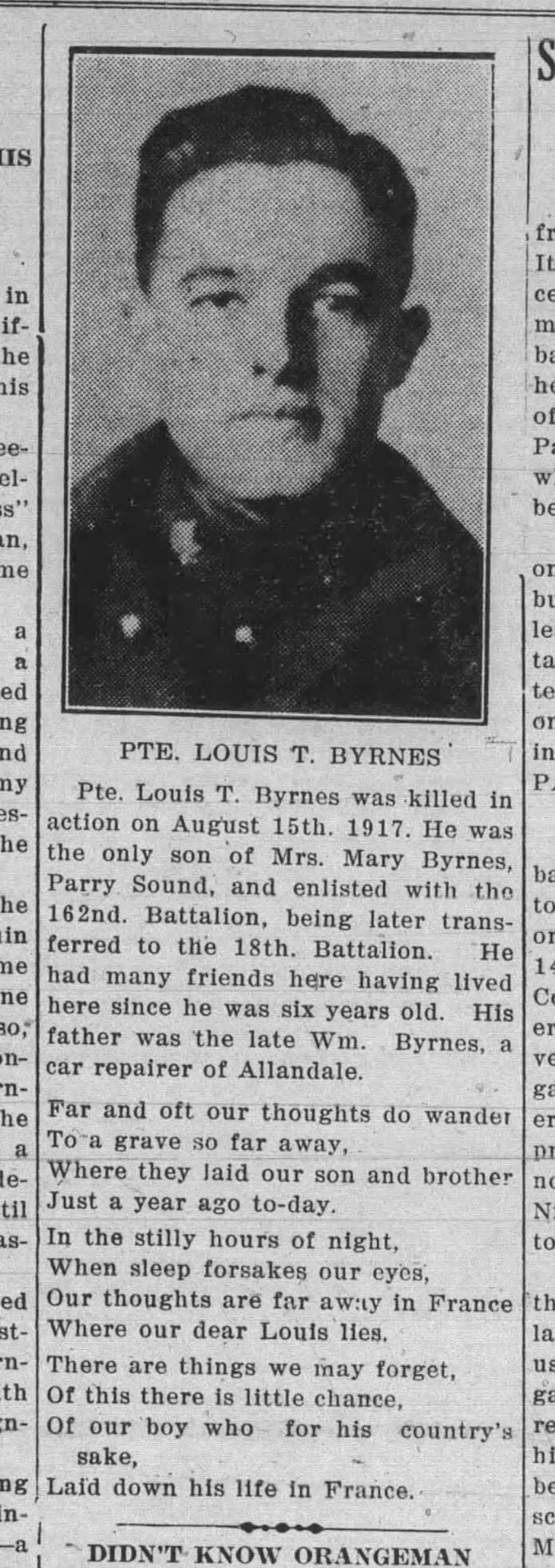 Pte. Louis T. Byrnes was killed in action on August 15th. 1917. He was the only son of Mrs. Mary Byrnes, Parry Sound, and enlisted with the 162nd. Battalion, being later trans- ferred to the 13th. Battalion. He had many friends here having lived here since he was six years old. His father was the late Wm. Byrnes, a car repairer of Allandale.