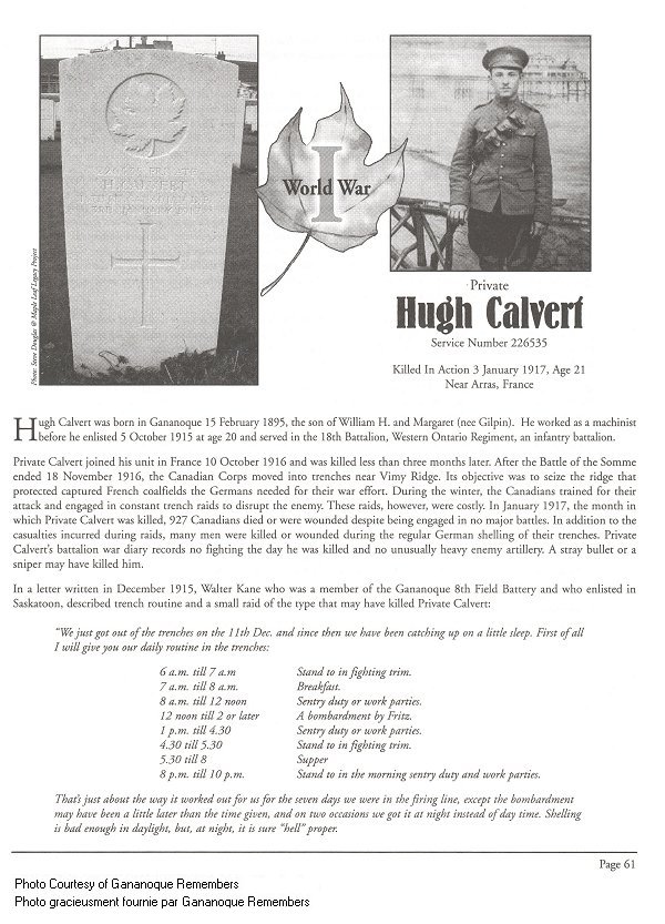 Hugh Calvert was born in Gananoque 15 February 1895, the son of William H. and Margaret (nee Gilpin). He worked as a machinist before he enlisted 5 October, 1915 at age 20 and served in the 18th Battalion, Western Ontario Regiment, an infantry battalion.