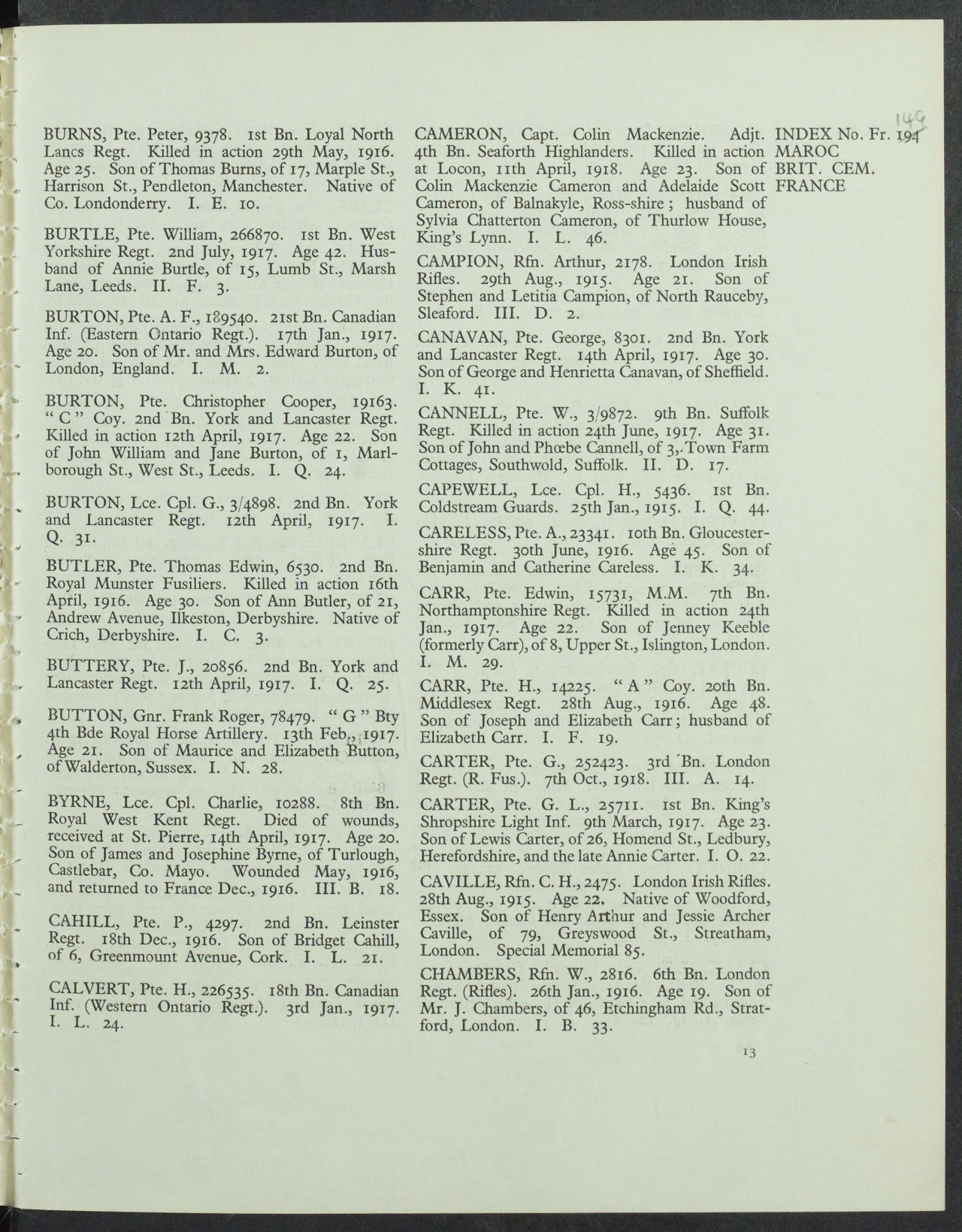 Private Calvert joined his unit in France 10 October, 1916 and was killed less than three months later. After the Battle of the Somme ended 18 November, 1916, the Canadian Corps move into trenches near Vimy Ridge. Its objective was to seize the ridge that protected captured French coalfields the Germans needed fro their war effort. During the winter, the Canadians trained for their attack and engaged in constant trench raids to disrupt the enemy. These raids, however, were costly. In January 1917, the month in which Private Calvert was killed, 927 Canadians were killed or wounded during the regular German shelling despite there being no major battles. In addition to the casualties incurred during raids, many men were killed or wounded during the regular German shelling of their trenches. Private Calvert’s battalion war diary records no fighting the day he was killed and not unusually heave enemy artillery. A stray bullet or a sniper may have killed him.