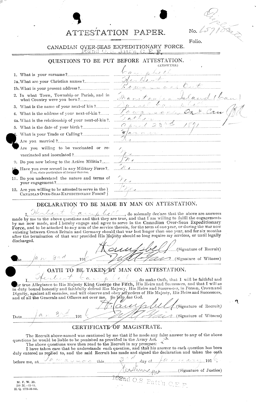 Enlistment: 3 January 1915; Regiment Number: 657105; Rank: Private; Regiment: 162nd OS Battalion, Canadian Expeditionary Force (C.E.F.).