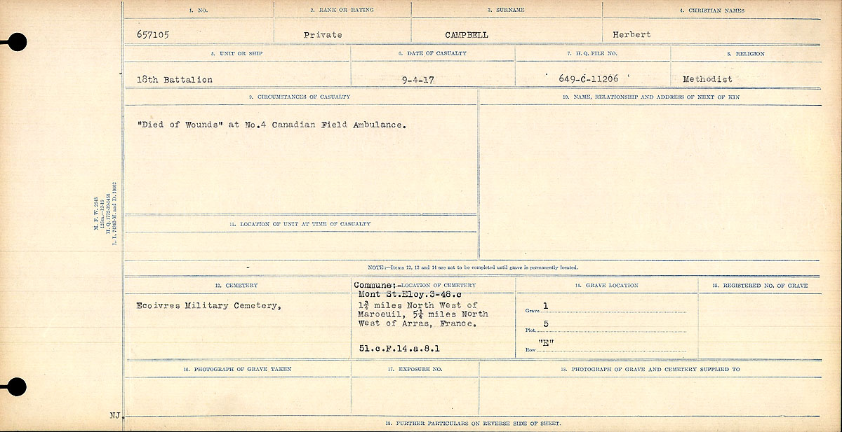 Cause and Death Location: “Died of Wounds” at No. 4 Canadian Field Ambulance. Wounds were acquired at the Battle of Vimy Ridge. (Citation Source: War Graves Registry: Circumstances of Death Records. Record Group 150, 1992–1993/314, Boxes 145–238. Library and Archives Canada, assessed Sept 2013, unigift)
