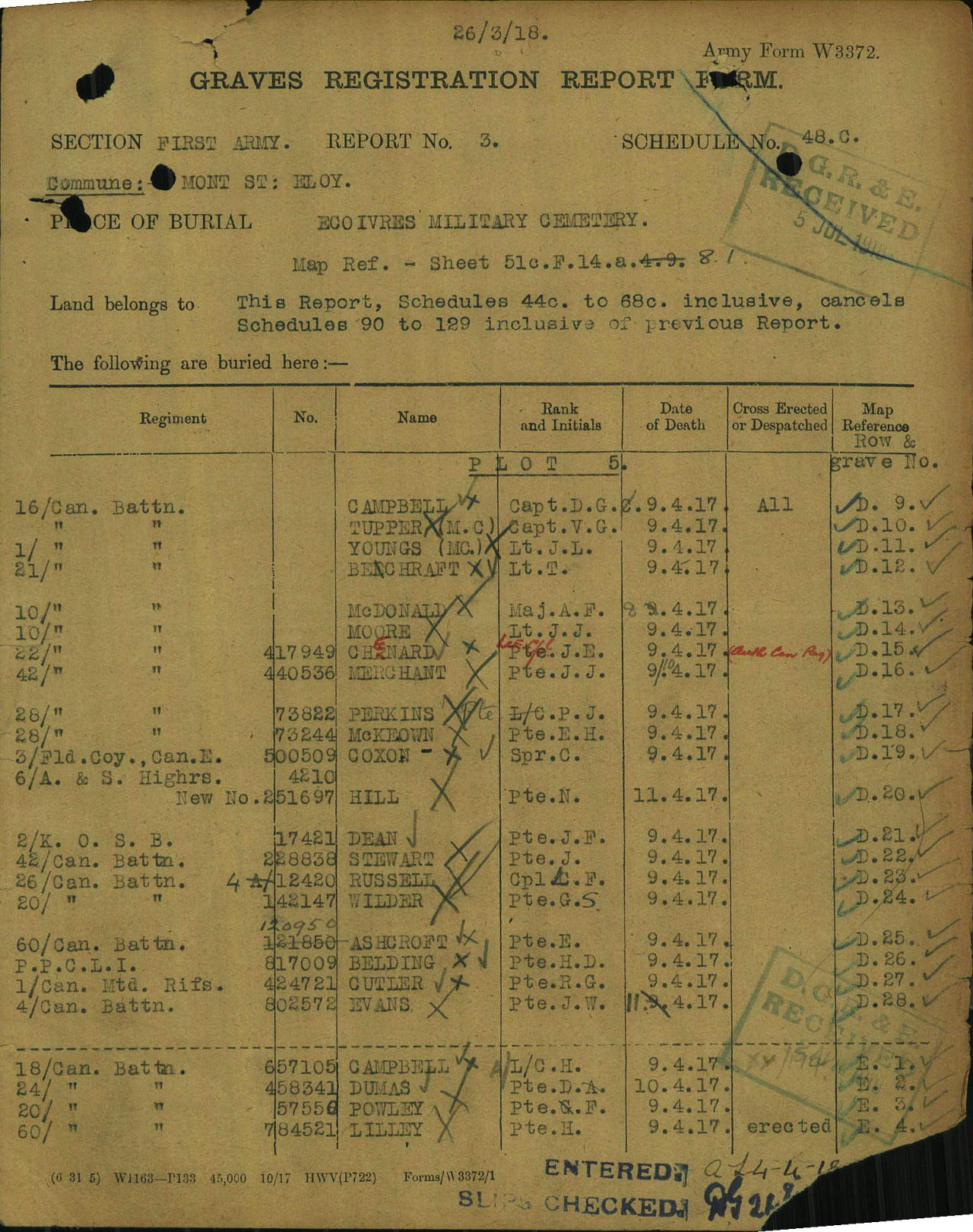 18th Battalion (The Essex and Kent Scottish), C.E.F. was re-formed March 15, 1915, London, Ontario. On April 8, 1917, they were participating in The Arras Offensive (9 April – 15 May, 1917)at Vimy Ridge (9-14 April 1917)(Citation Source: The Regimental Rougue, http://regimentalrogue.com/battlehonours/bathnrinf/31-ekscot.htm, assessed 9 Oct 2013, unigift)