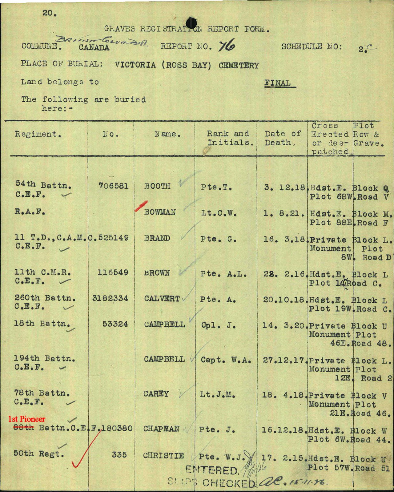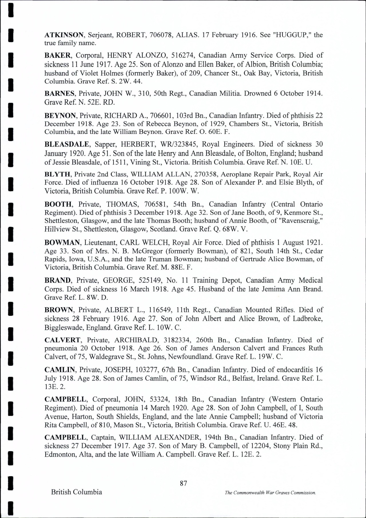 Family Search: Private John Campbell was born on 15 February 1892, in South Shields, Tyne and Wear, England, United Kingdom as the son of John Campbell. He immigrated to Canada in 1913 and lived in Victoria, British Columbia, Canada in 1920. He registered for military service in 1914. In 1914, at the age of 22, his occupation is listed as machinist. He died on 14 March 1920, in Esquimalt, Capital, British Columbia, Canada, at the age of 28, and was buried in Ross Bay Cemetery, Victoria, Vancouver Island, British Columbia, Canada.
