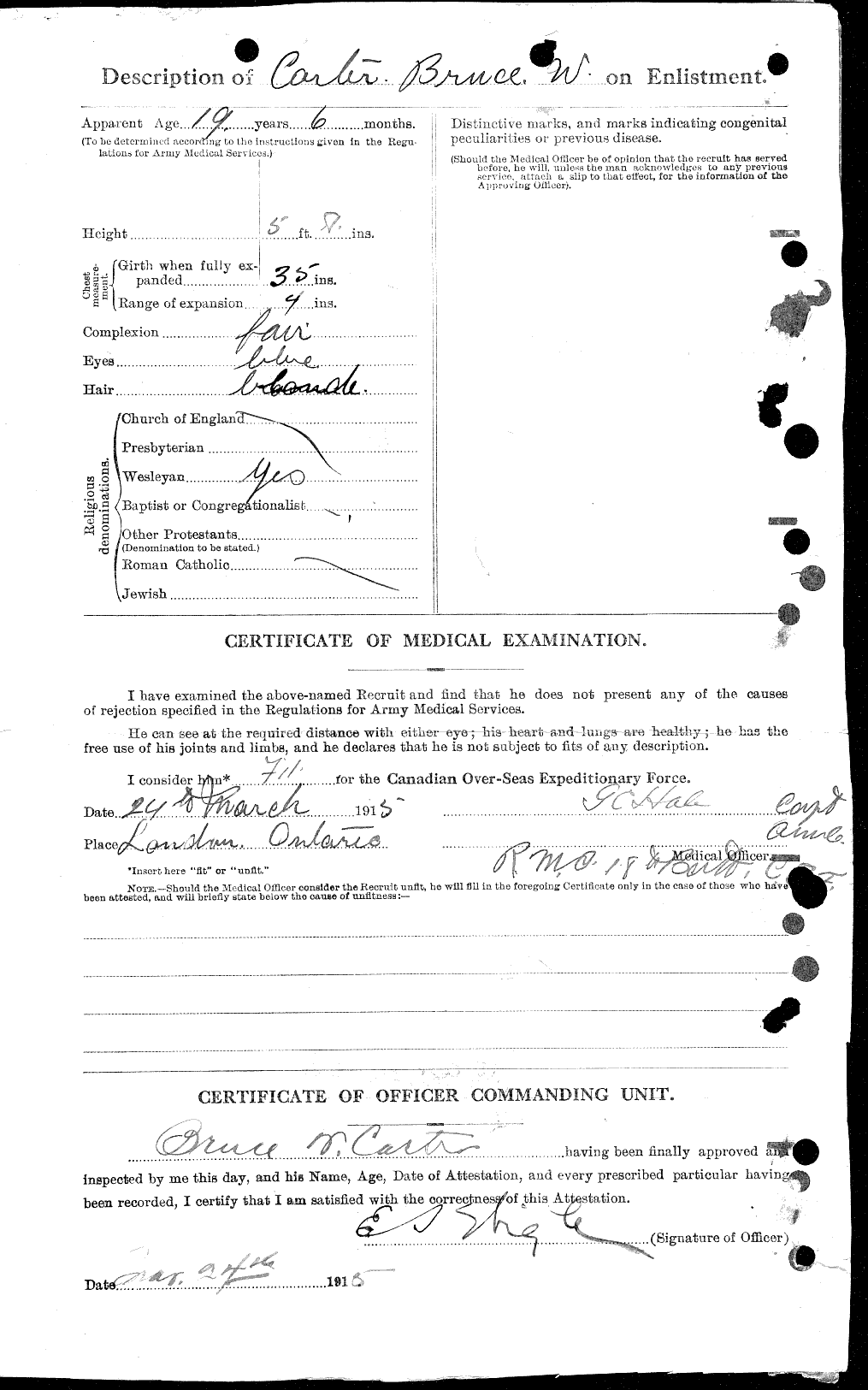 Bruce Wilmot Carter served in the 18th Battalion of the Canadian Expeditionary Forces. He was the son of Albert Carter of Thamesford. Bruce married Florence W. Gibbons (1892-1967).
