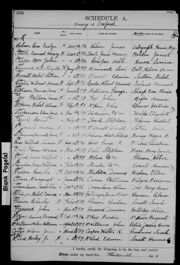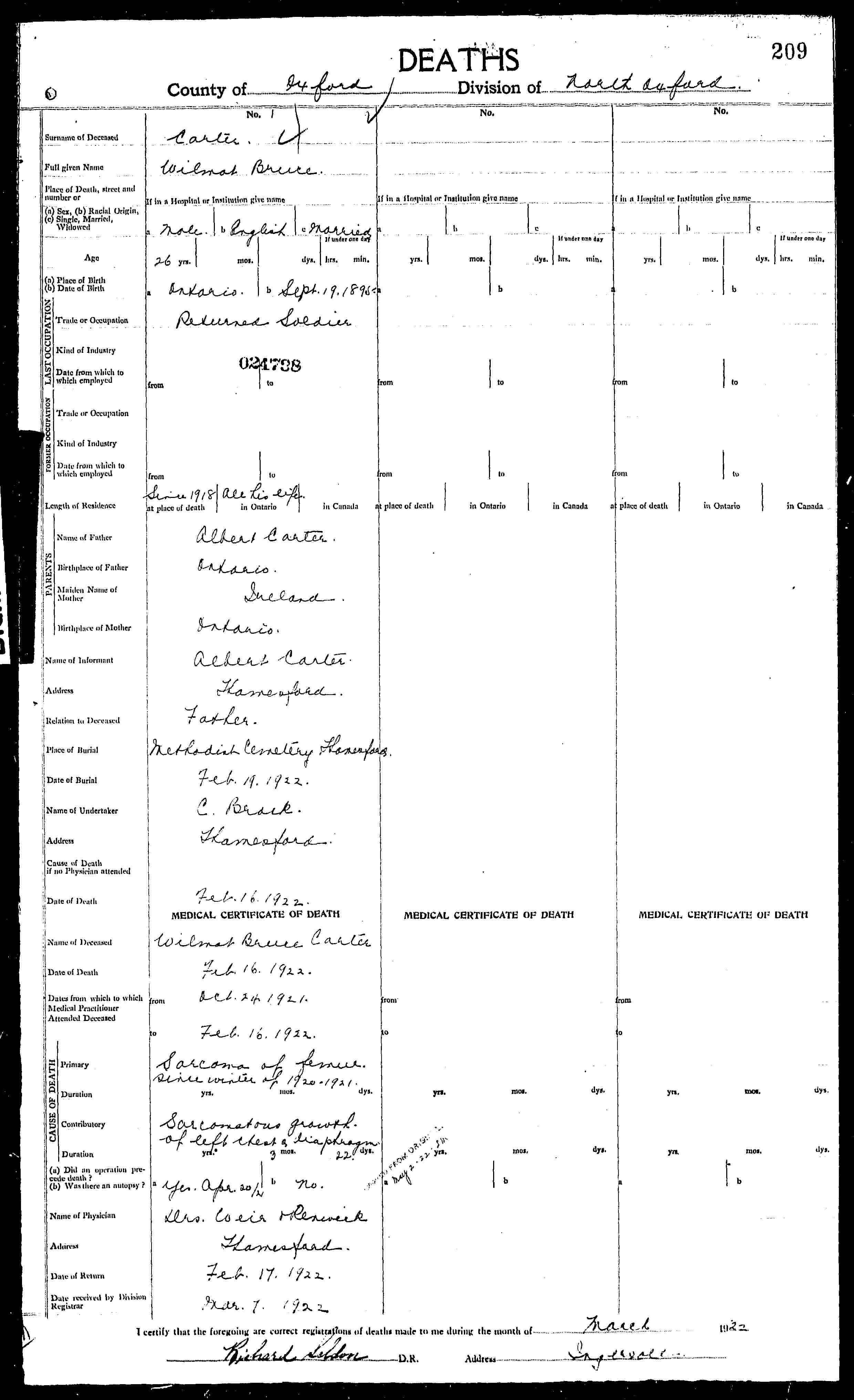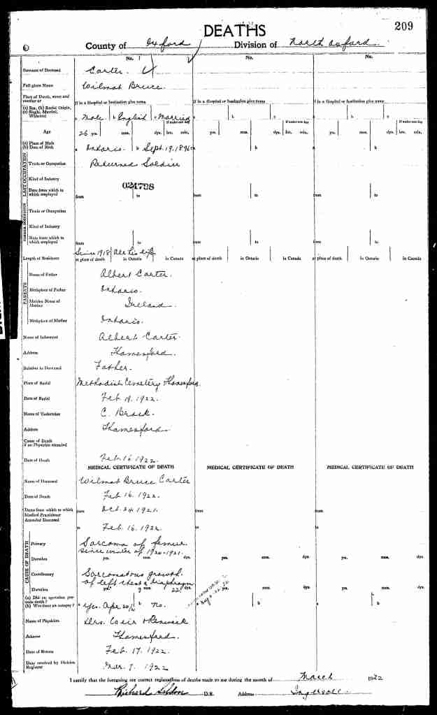 Family Search: When Private Bruce Wilmot Carter was born on 19 September 1896, in East Nissouri Township, Oxford, Ontario, Canada, his father, Albert Edward Carter, was 38 and his mother, Hannah Emma Ireland, was 30. He married Florence Woolridge Gibbons on 14 June 1921, in London, Ontario, Canada West, British Colonial America. He lived in Ontario, Canada in 1896 and Oxford, Ontario, Canada for about 10 years. He registered for military service in 1914. In 1914, at the age of 18, his occupation is listed as fireman, grand trunk railway. He died on 16 February 1922, in North Oxford Township, Oxford, Ontario, Canada, at the age of 25, and was buried in Wesley Methodist Cemetery, Thamesford, Oxford, Ontario, Canada.