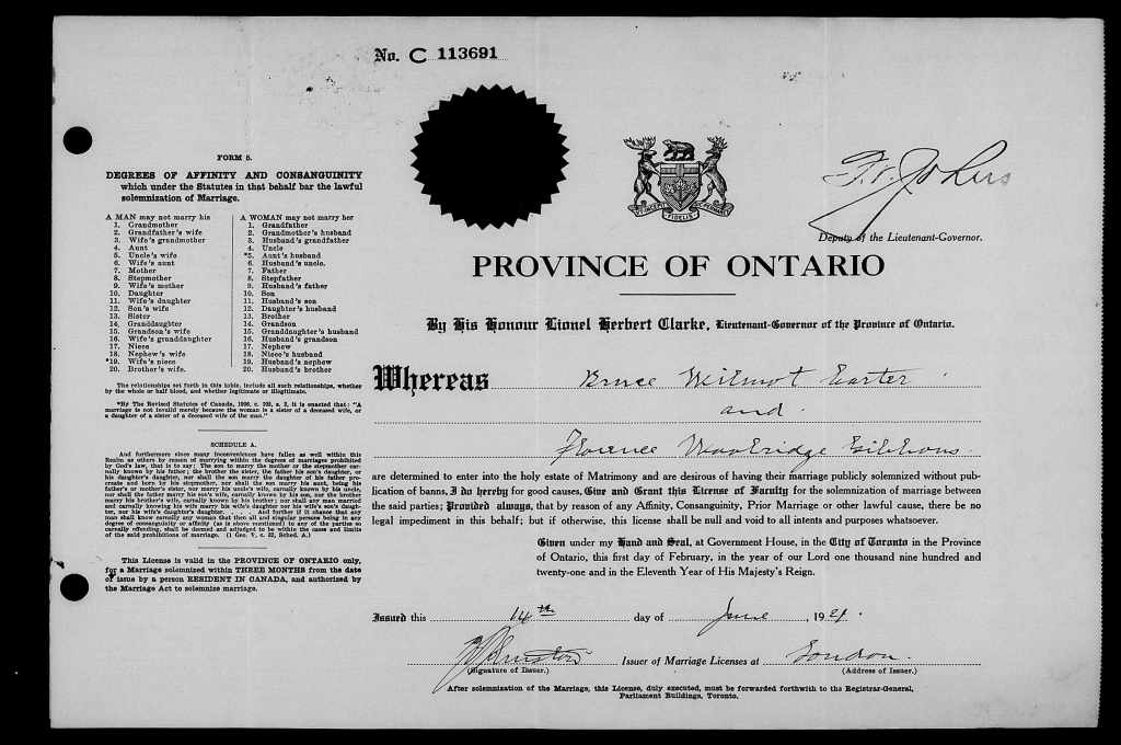 | June 15, 1921 | Married | Marries Florence Woolridge Gibbons at London, Ontario. |