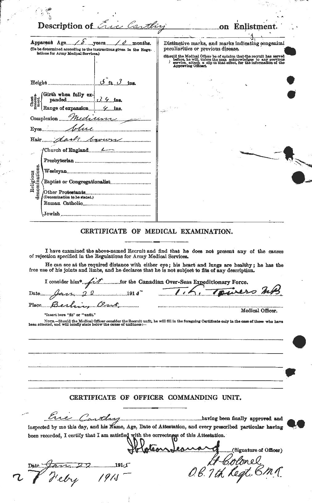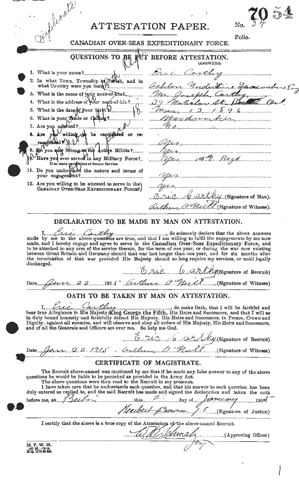 “Eric was born in Ashton-under-Lyne, Lancashire, England on March 13, 1896. He enlisted on January 22, 1915 at Berlin, Ontario and joined the 18th Battalion, Canadian Infantry, Western Ontario Regiment. Eric had worked as a woodworker.