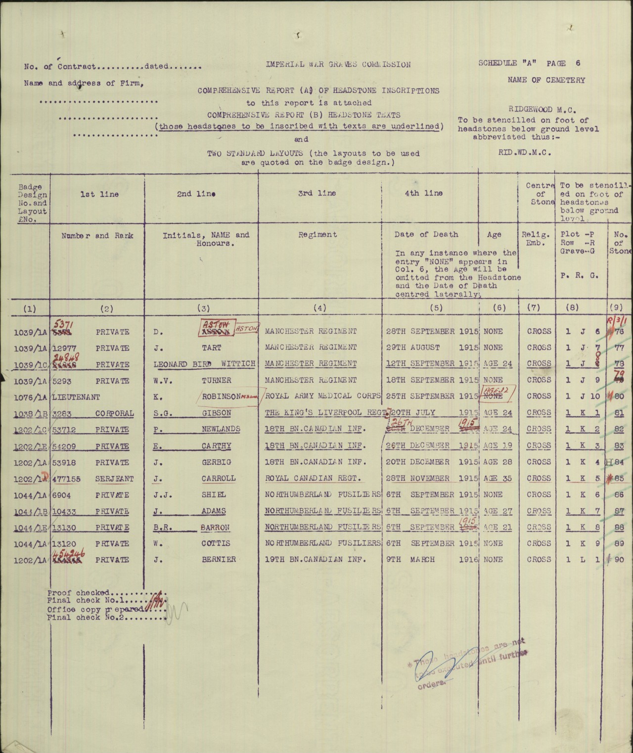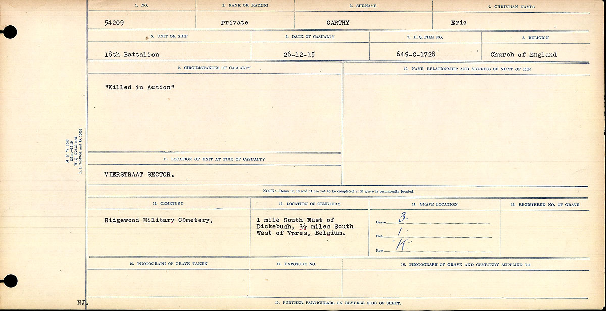 He went overseas in April 1915 and to the front on September 16, 1915. Eric was killed in action on December, 26, 1915 at the age of 19. Eric is buried at Ridge Wood Military Cemetery near Ypres, Belgium, grave 1.K.3. He is remembered by the Royal Canadian Legion, Ontario: Branch 50 – Fred Gies, Kitchener – Wall of Remembrance.