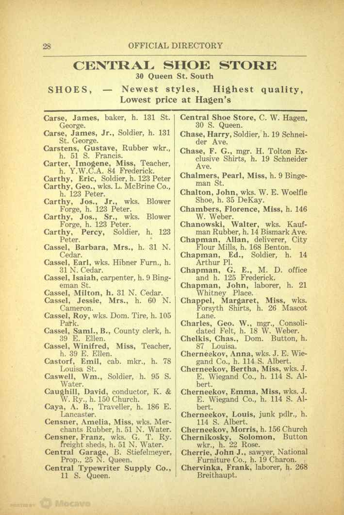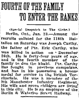 Eric was the son of Joseph and Harriet Boothby Carthy of 39 Waterloo Street, Berlin, later of 277 Nelson Street, Kitchener.
