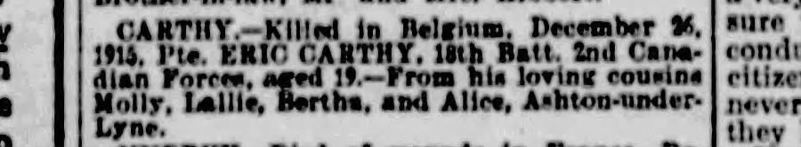 Younger brother to Private Percy Carthy killed in action September 15, 1916.