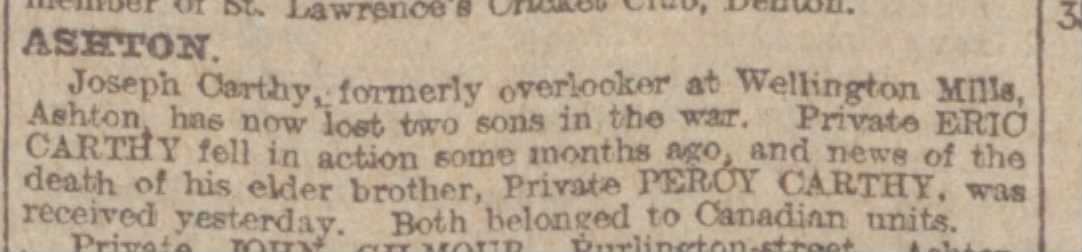 Older brother to Private Eric Carthy who, was himself, killed in action first on September 16, 1915.