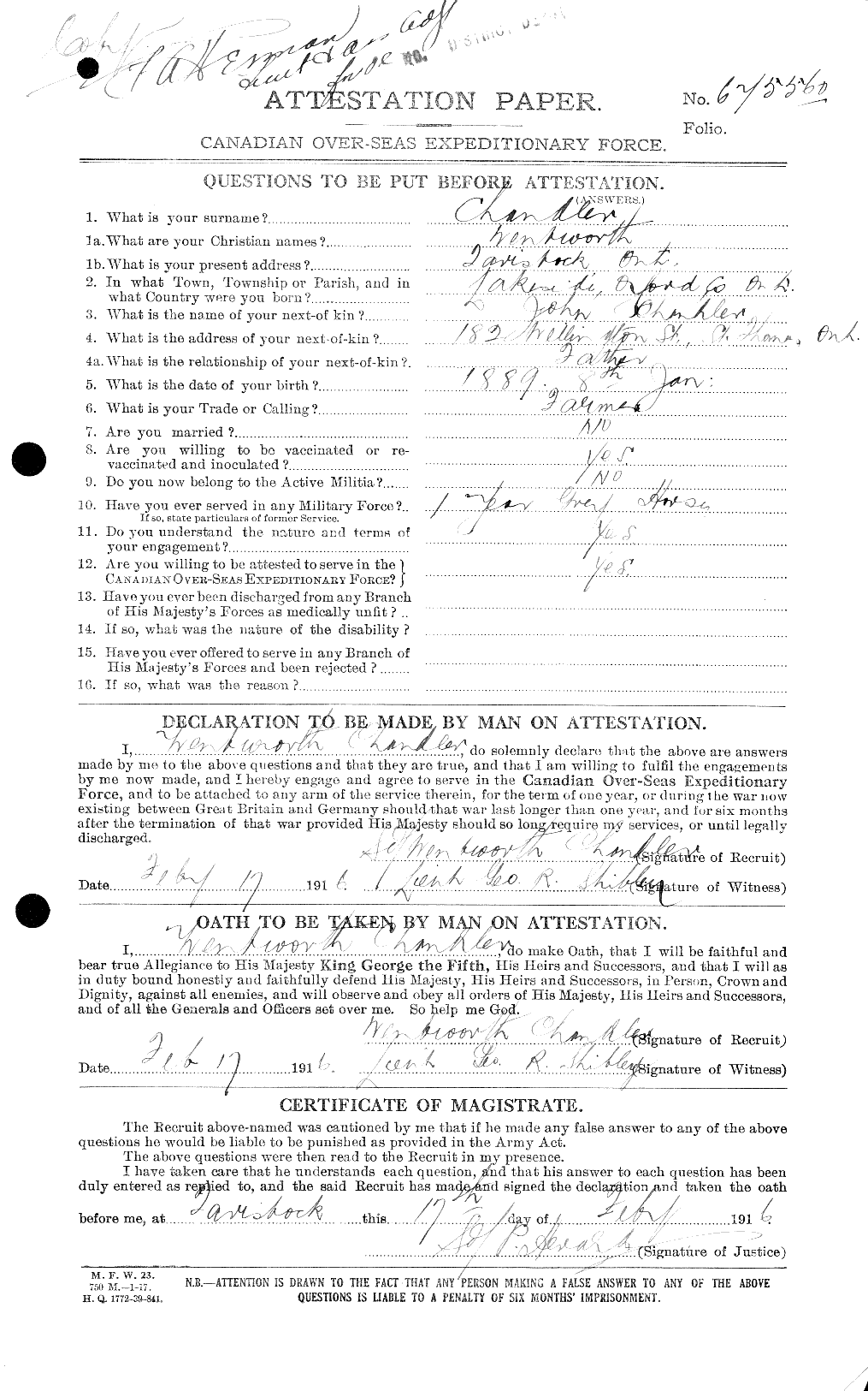 Chandler, Wentworth: Service no. 675560 CVWM Page Digitized Service Record Source: Elgin County Book of Remembrance. Find-A-Grave Photo submission of headstone by The London Robinsons at the 18th Battalion Facebook Group. Cause of Death: Pulmonary Tuberculosis Share this: Click to email a link to a friend (Opens in new window) Email Click to share on Facebook (Opens in new window) Facebook Click to share on X (Opens in new window) X Click to share on Reddit (Opens in new window) Reddit Click to share on LinkedIn (Opens in new window) LinkedIn Click to print (Opens in new window) Print Click to share on Tumblr (Opens in new window) Tumblr Click to share on Pocket (Opens in new window) Pocket Click to share on Pinterest (Opens in new window) Pinterest Click to share on Telegram (Opens in new window) Telegram Click to share on WhatsApp (Opens in new window) WhatsApp Like Loading...