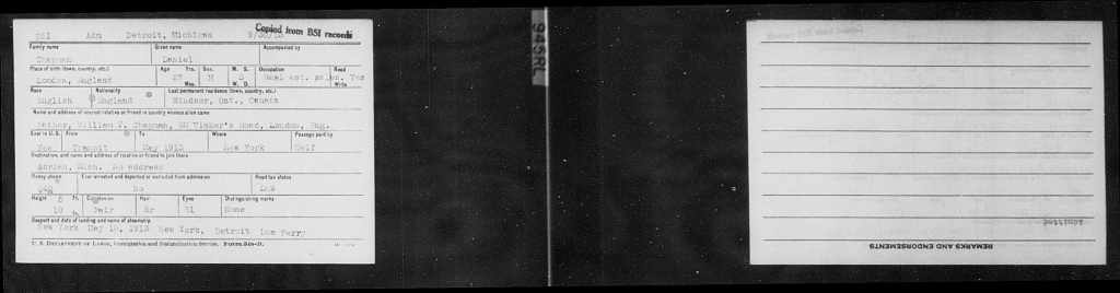 | September 30, 1913 | Emigrates | Emigrates to Adrian, Michigan via New York City. He lists his profession as a real estate salesman. His last permanent residence was Windsor, Ontario. He arrived New York on May 18 and has $40 on his person. He can read and write. |