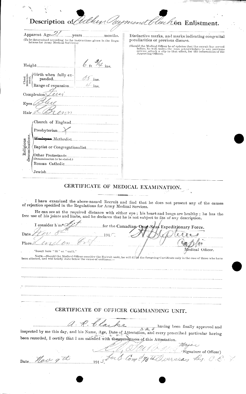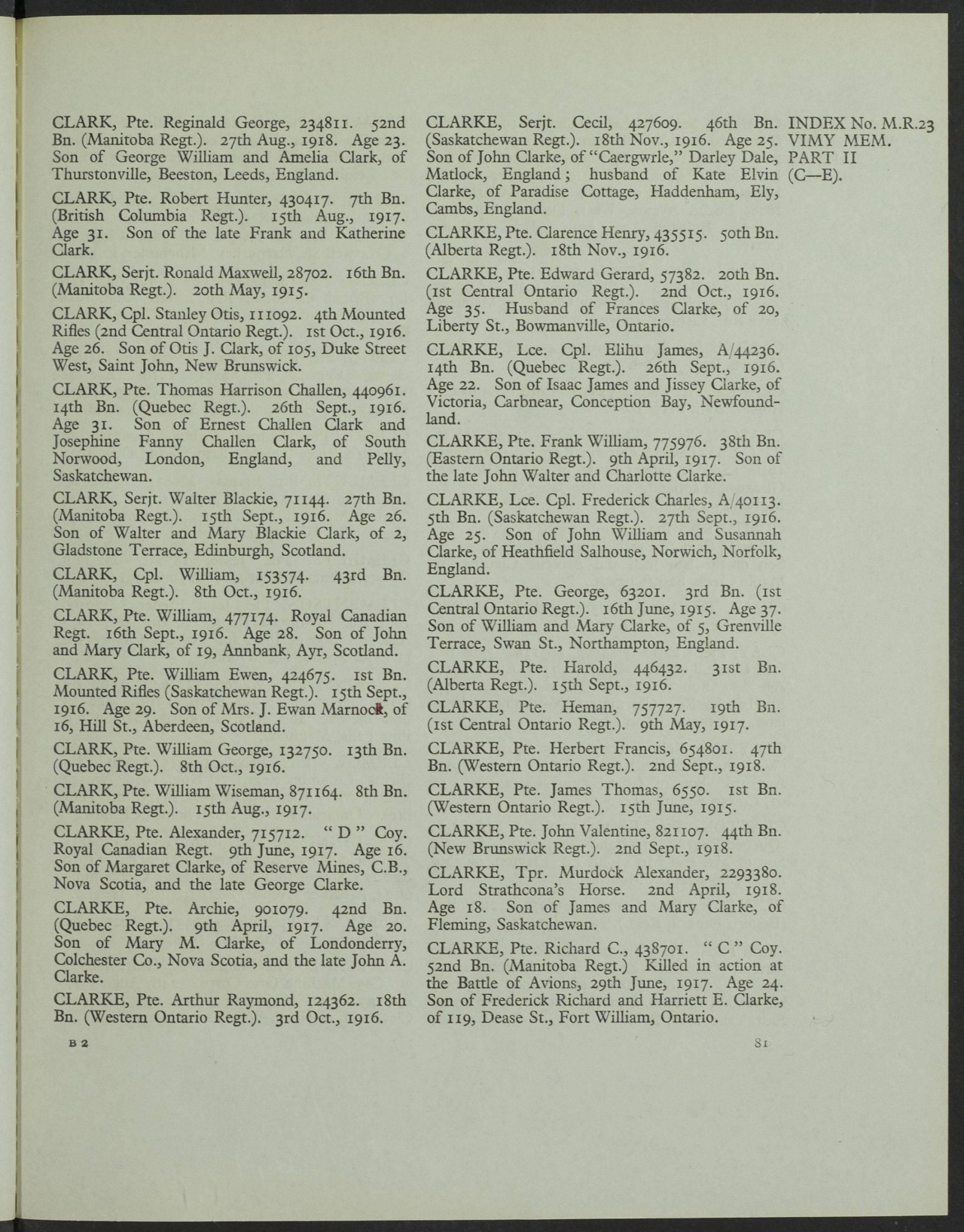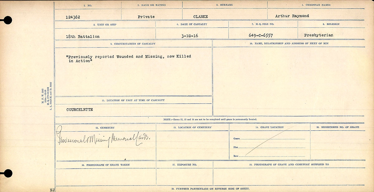 Clarke, Arthur Raymond: Service no. 124362 CVWM Page Digitized Service Record Source: October 1916 casualty. Find-A-Grave “Previously reported Wounded and Missing, now Killed in Action” Share this: Click to email a link to a friend (Opens in new window) Email Click to share on Facebook (Opens in new window) Facebook Click to share on X (Opens in new window) X Click to share on Reddit (Opens in new window) Reddit Click to share on LinkedIn (Opens in new window) LinkedIn Click to print (Opens in new window) Print Click to share on Tumblr (Opens in new window) Tumblr Click to share on Pocket (Opens in new window) Pocket Click to share on Pinterest (Opens in new window) Pinterest Click to share on Telegram (Opens in new window) Telegram Click to share on WhatsApp (Opens in new window) WhatsApp Like Loading...