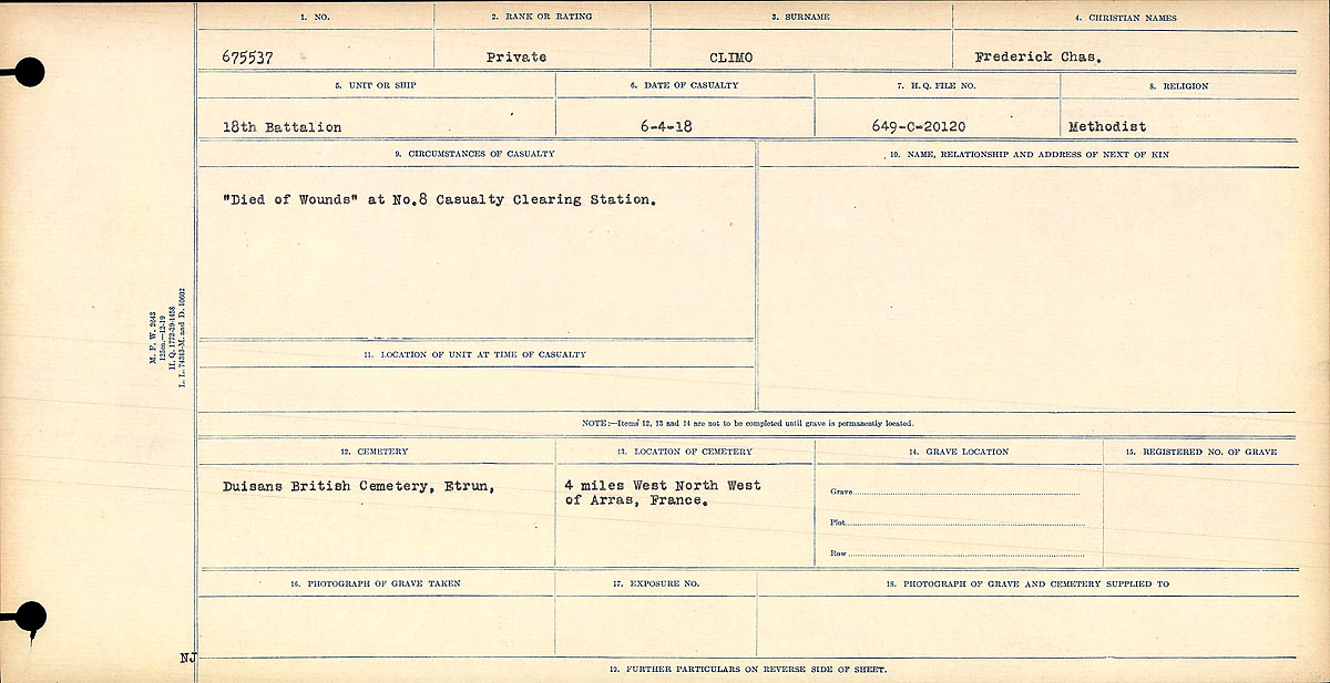 Climo, Frederick Charles: Service no. 675537 CVWM Page Digitized Service Record Source: Oxford Remembers Oxford’s Own Find-A-Grave Source: Oxford Remembers Oxford Own “Died of Wounds” at No. 8 Casualty Clearing Station. Share this: Click to email a link to a friend (Opens in new window) Email Click to share on Facebook (Opens in new window) Facebook Click to share on X (Opens in new window) X Click to share on Reddit (Opens in new window) Reddit Click to share on LinkedIn (Opens in new window) LinkedIn Click to print (Opens in new window) Print Click to share on Tumblr (Opens in new window) Tumblr Click to share on Pocket (Opens in new window) Pocket Click to share on Pinterest (Opens in new window) Pinterest Click to share on Telegram (Opens in new window) Telegram Click to share on WhatsApp (Opens in new window) WhatsApp Like Loading...