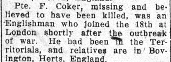 Coker, Frederick: Service no. 54077 CVWM Page Digitized Service Record Source: Elgin County Book of Remembrance Find-A-Grave Source: Toronto Telegram. October 1916. Via David Archer. “Previously reported Missing, believed Killed, now Killed in Action” Share this: Click to email a link to a friend (Opens in new window) Email Click to share on Facebook (Opens in new window) Facebook Click to share on X (Opens in new window) X Click to share on Reddit (Opens in new window) Reddit Click to share on LinkedIn (Opens in new window) LinkedIn Click to print (Opens in new window) Print Click to share on Tumblr (Opens in new window) Tumblr Click to share on Pocket (Opens in new window) Pocket Click to share on Pinterest (Opens in new window) Pinterest Click to share on Telegram (Opens in new window) Telegram Click to share on WhatsApp (Opens in new window) WhatsApp Like Loading...