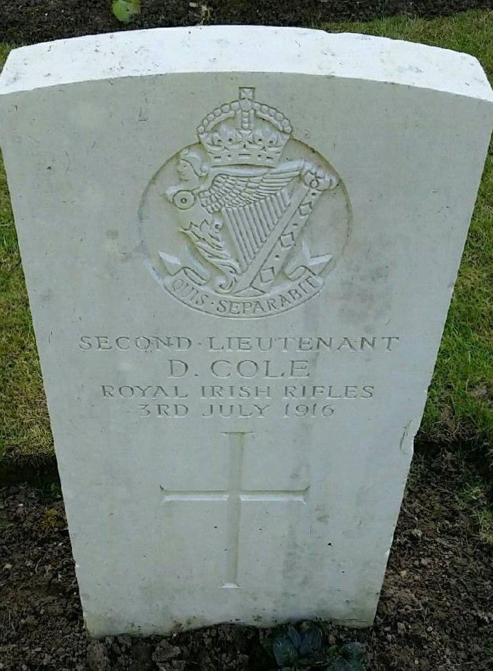 Family Search: Second Lieutenant David Cole was born on 15 January 1888, in London, England, United Kingdom as the son of John R. Cole. He registered for military service in 1914. In 1914, at the age of 26, his occupation is listed as engineer. He died on 3 July 1916, in Somme, France, at the age of 28, and was buried in Mesnil-Martinsart, Somme, Hauts-de-France, France.