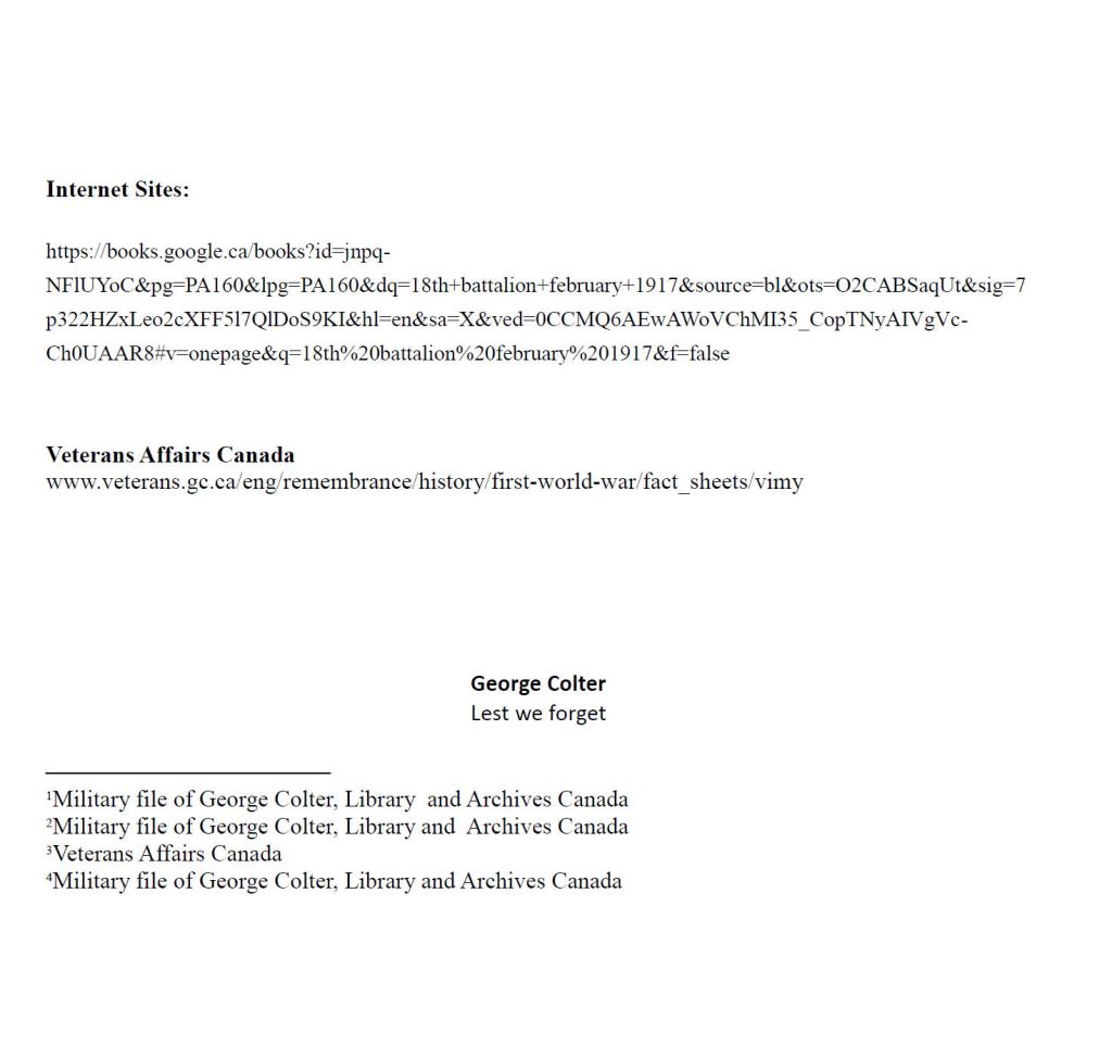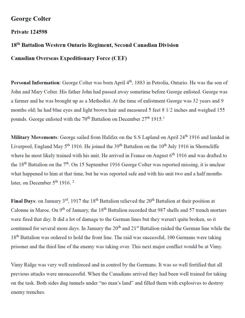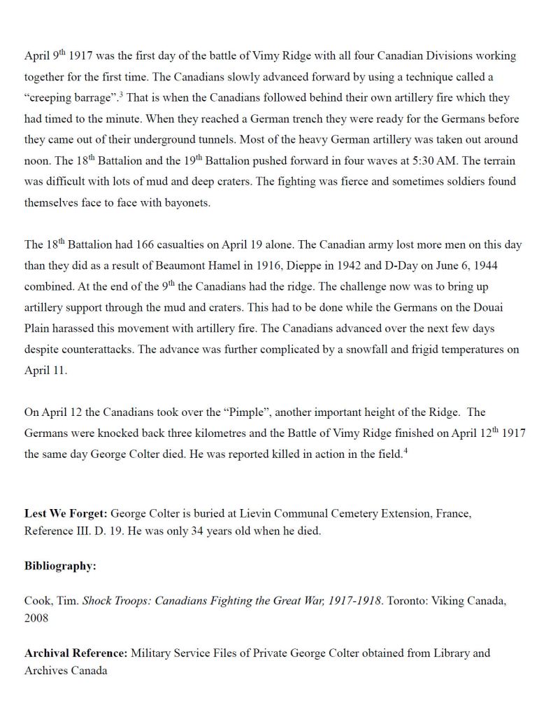 Family Search: When Private George Colter was born on 4 April 1883, in Petrolia, Lambton, Ontario, Canada, his father, John Coulter, was 49 and his mother, Mary C. Mark, was 43. He lived in York, Ontario, Canada in 1901 and Ransom, North Dakota, United States in 1910. He registered for military service in 1915. In 1916, at the age of 33, his occupation is listed as farmer in Petrolia, Lambton, Ontario, Canada. He died on 12 April 1917, in Thélus, Pas-de-Calais, Nord-Pas-de-Calais, France, at the age of 34, and was buried in Liévin, Pas-de-Calais, Nord-Pas-de-Calais, France.