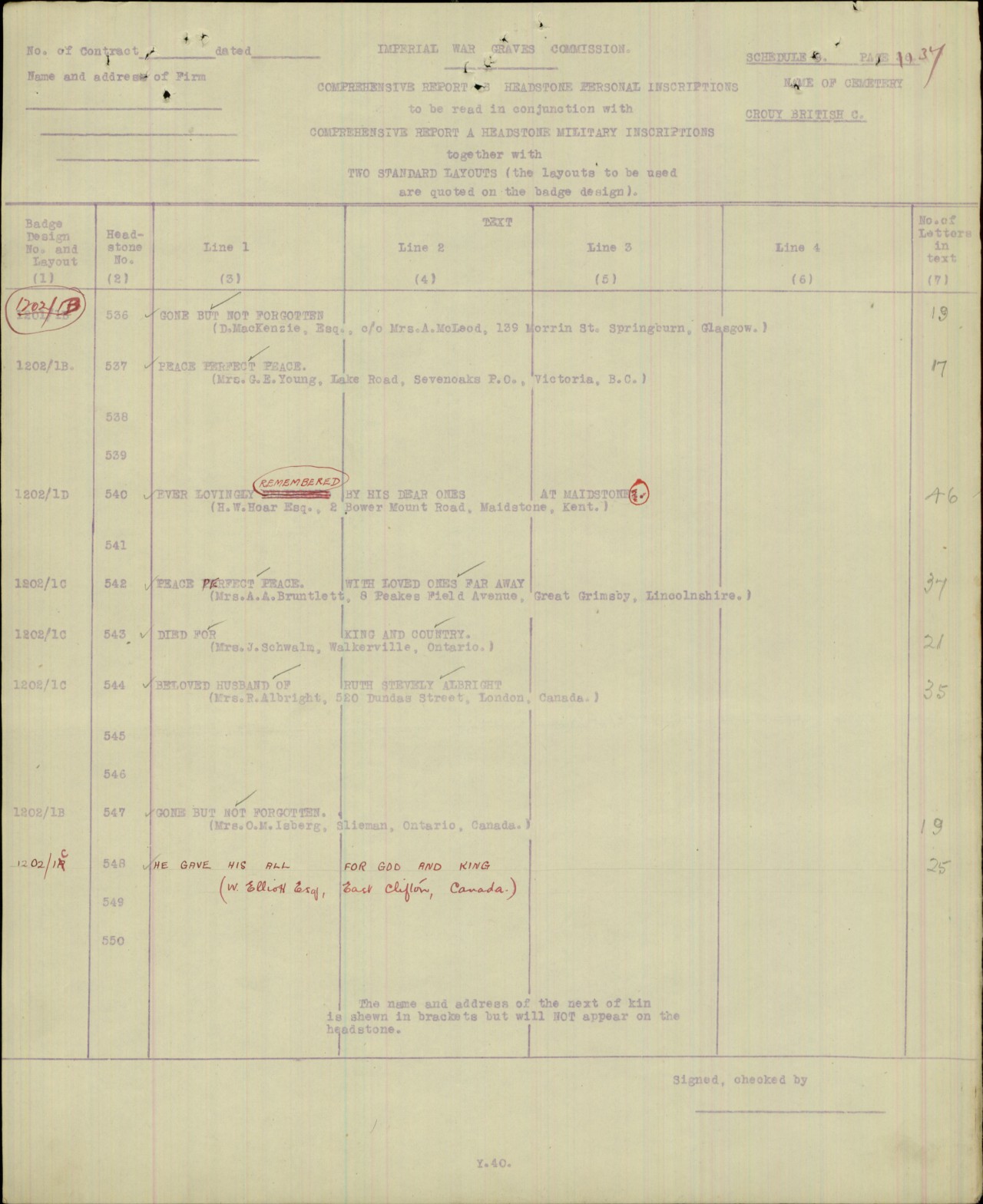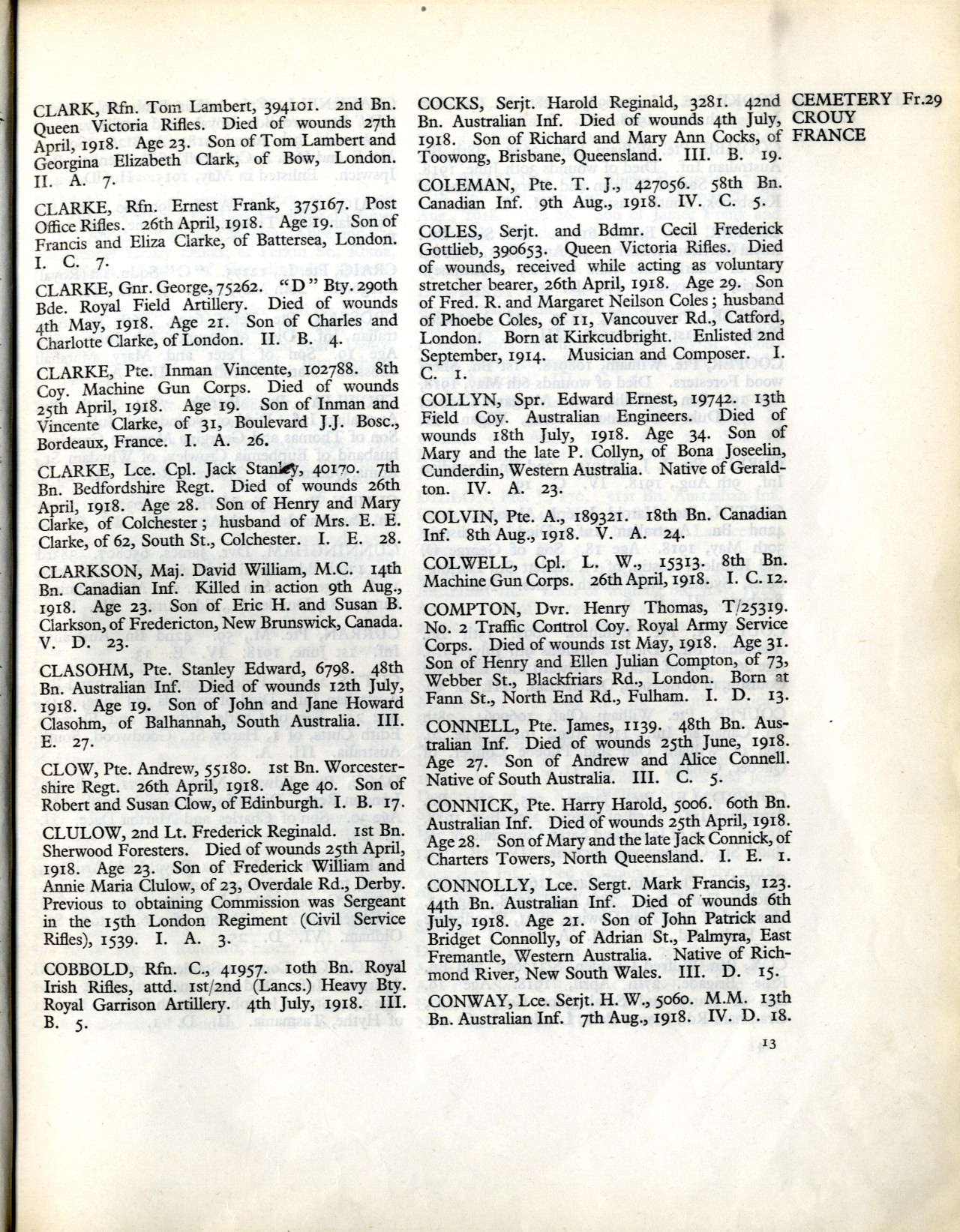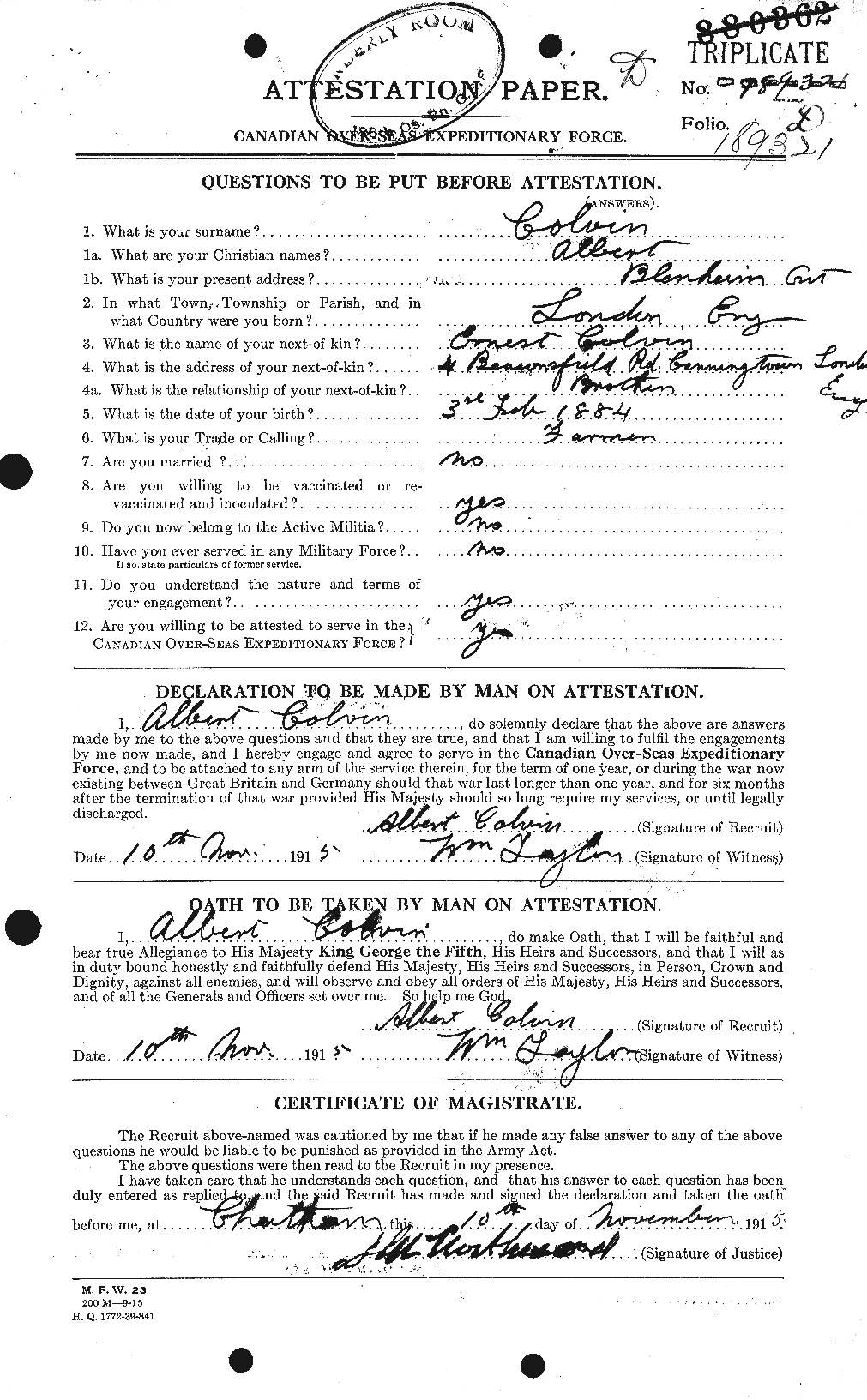 Family Search: Private Albert Colvin was born on 3 February 1884, in London, England, United Kingdom. He immigrated to Canada in 1913. He registered for military service in 1915. In 1915, at the age of 31, his occupation is listed as farmer in Blenheim, Kent, Ontario, Canada. He died on 8 August 1918, in Marcelcave, Somme, Picardie, France, at the age of 34, and was buried in Crouy British Cemetery, Crouy, Somme, Picardie, France.