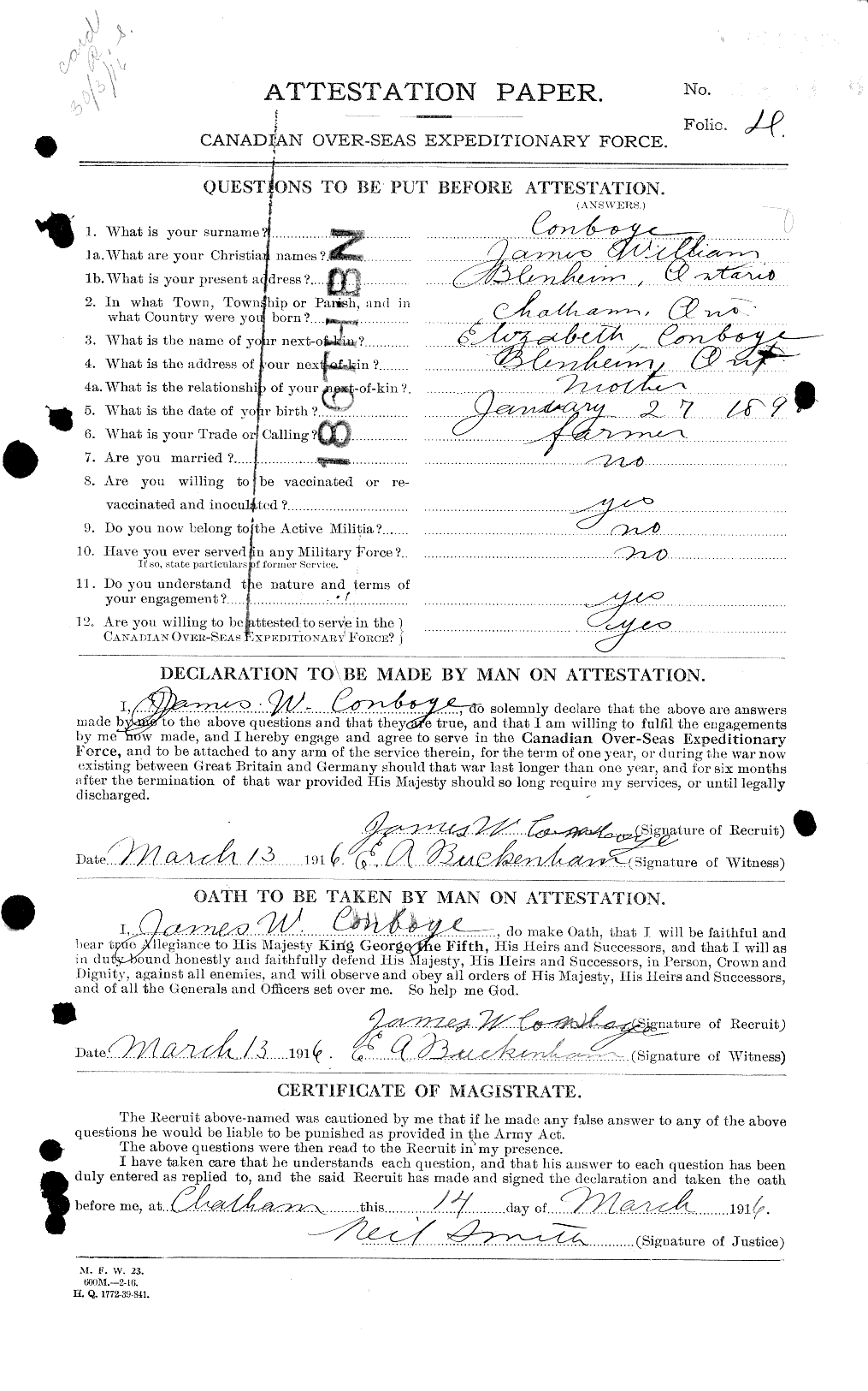 | March 13, 1916 | Enlists | Enlists at Chatham, Ontario with the 186th Overseas Battalion. His next of kin is listed as his mother, Elizabeth Comboye. He is living at Blenheim, Ontario and lists his trade as a farmer. He is one-month past his 18th birthday and stands 5’6” and weights 125 pounds. |